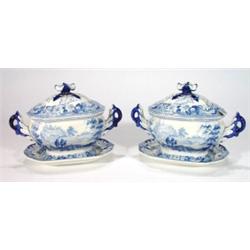 Pair of early 19th century Turner blue and white transfer printed Villager patterned pottery tureens and stands with foxes head handles, 16cm high