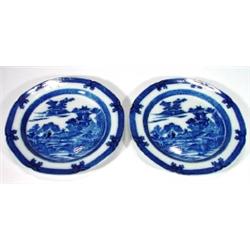 Pair of early 19th century blue and white pearlware plates, transfer printed with Chinese willow pattern and bison