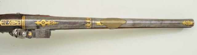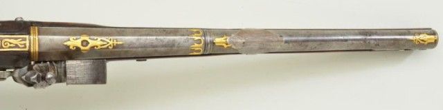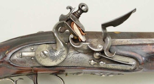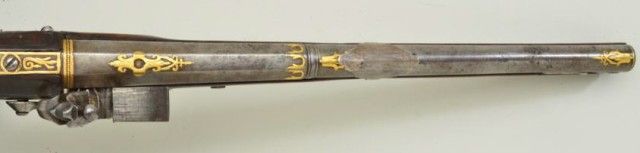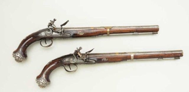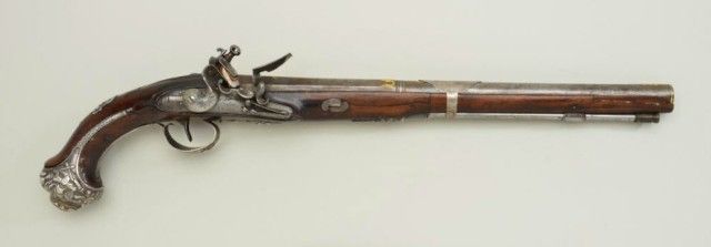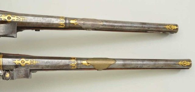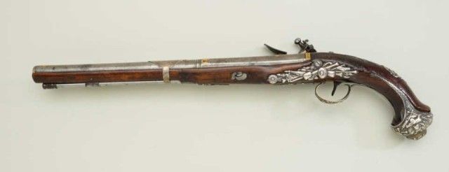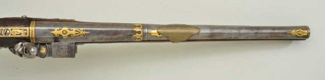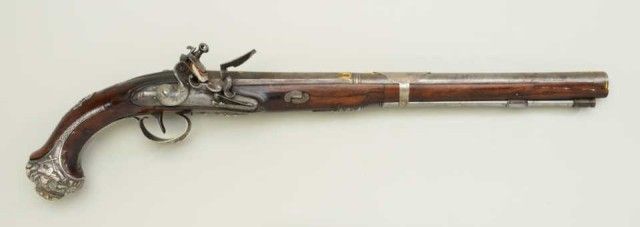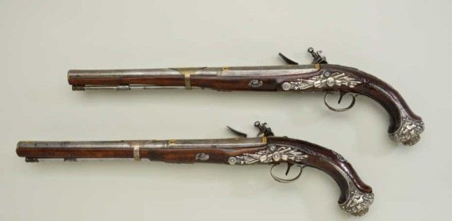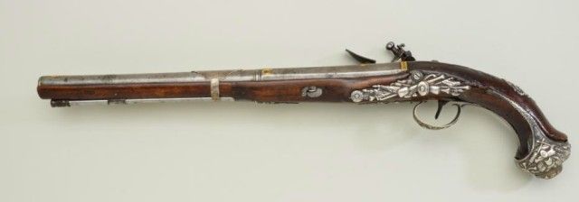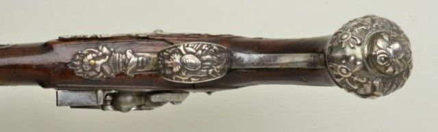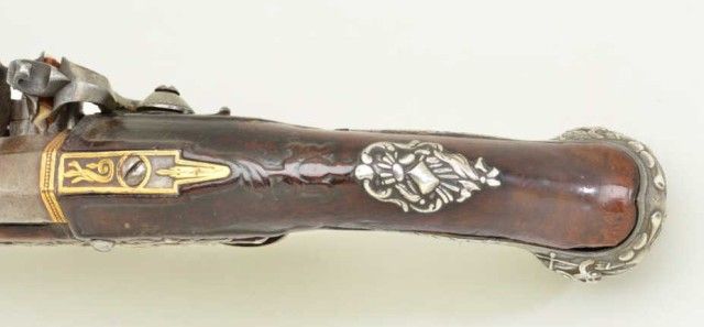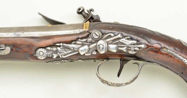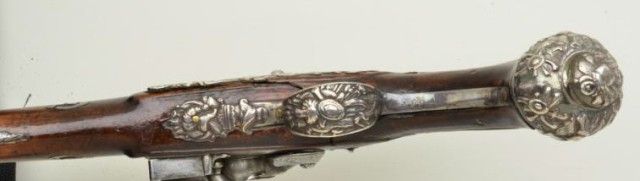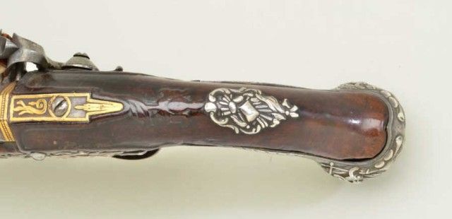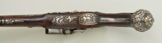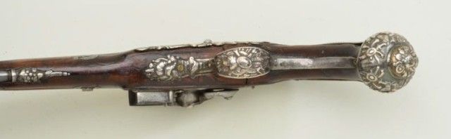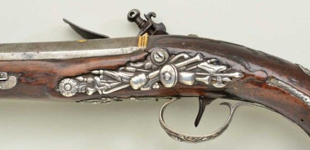 Pair of elaborate silver mounted Flintlock pistols signed “Fatou a Paris” made for eastern trade. The pair measure 21-5/8” overall with 15” barrels of approx 60 cal smooth bore. The silver mountings are goodquality and show well defined figural of cannons, stands of arms, and floral motif. The barrels show a Damascus pattern with gold decoration and a small maker’s mark with Arabic writing. The pistols are nicelystocked in good quality walnut with carving at the wrist and molding around the mounts. The condition is good to very good with some light erosion and pinprick pitting on the metal but sharp edges and engraving on thelock. The stocks show some minor restoration and light refinish and are at least very good. Fatou was one of the top royal gun makers who worked into the Napoleonic era and was known for his elaborate decoration onhigh grade arms. Est.;$3,000-$6,000.