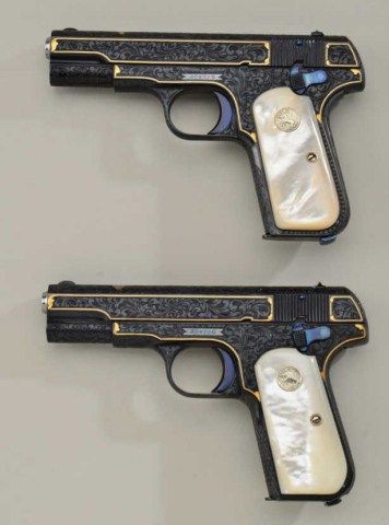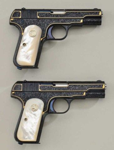 Pair of elaborately custom engraved and flush gold inlaid Colt Model 1903 pocket autos in .32 ACP cal., by Ken Hurst. The pair show full coverage with fine quality deep engraving with portrait of eagle on top ofeach front of slide influenced by C. Helfricht; the pistols are numbered 1 and 2 in gold and the engraving is very precise and well detailed and they are signed beneath the grips. The pair are numbered #204719 and#204710 and are fitted with medallion pearl grips of modern manufacture. The pistols are finely royal blued with fired blue accents; the condition is fine to excellent overall with 99%+ finish and no evidence of use since ornamentation. Robert E. Petersen estate. Est.: $3,000-$6,000.