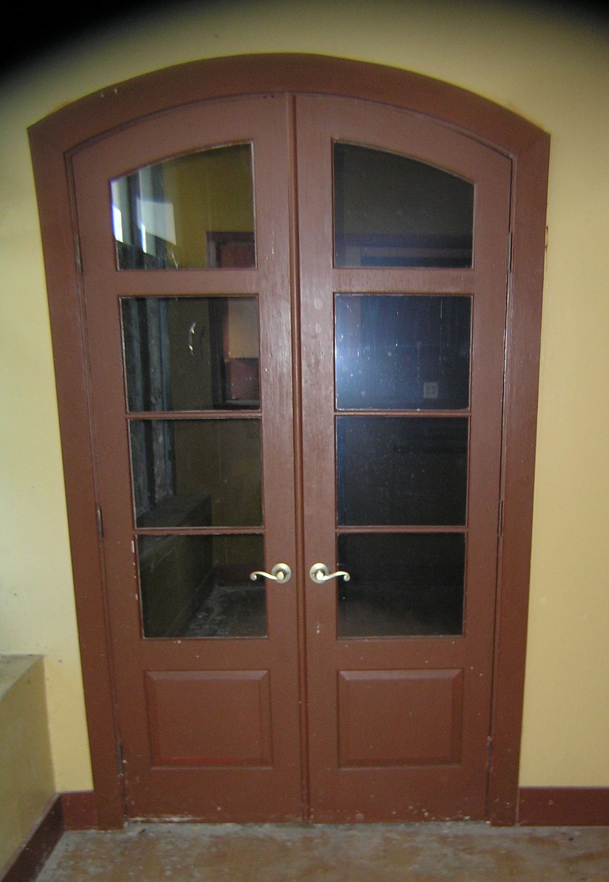 Pair of elegant 8 pane curved top hard wood doors with all hardware est. value $1200.00-$1500.00