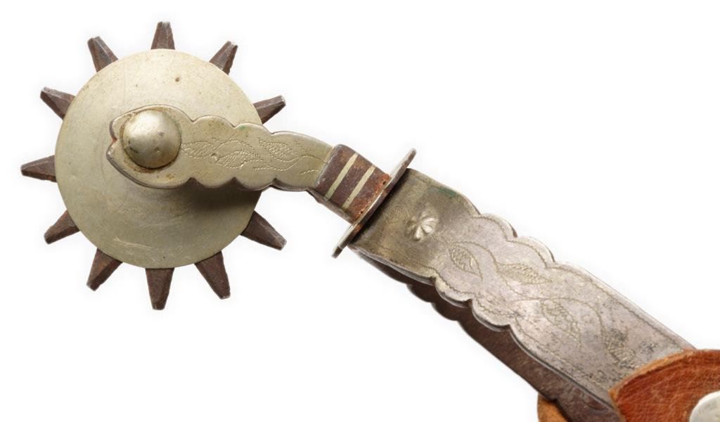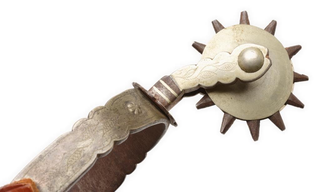 Pair of engraved silver overlay spurs with 2-1/4” 12 point rowels and “jingle” plain conchas on each side of both rowels; no visible maker marks; plain leather straps. Est.: $300-$600.