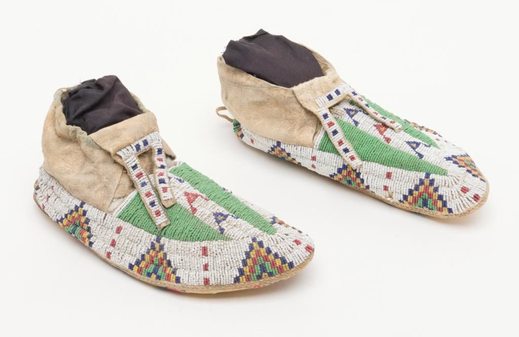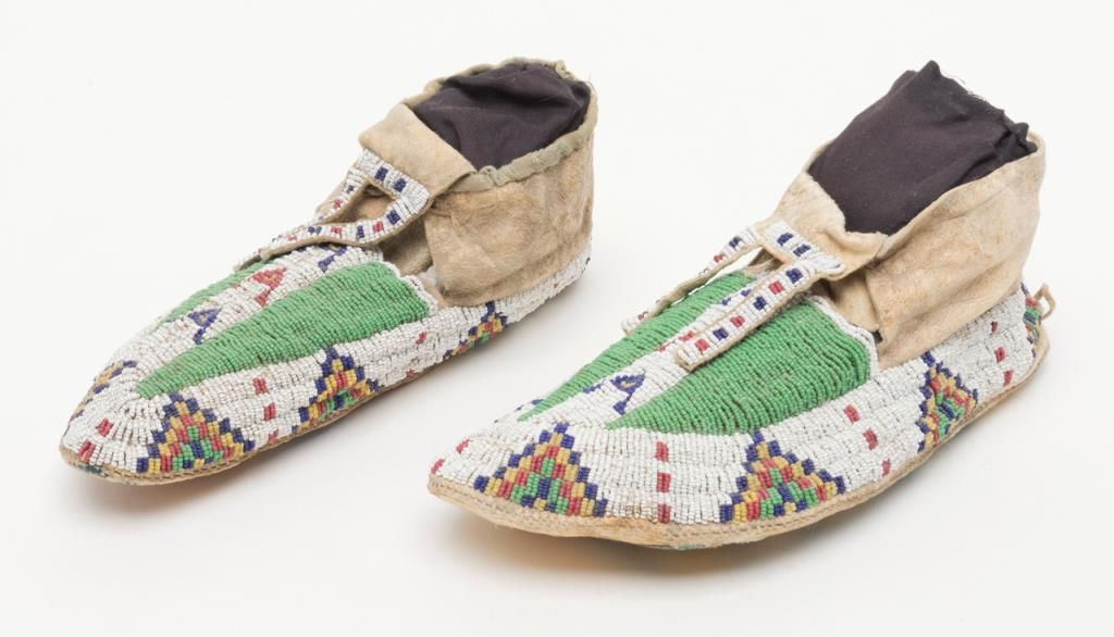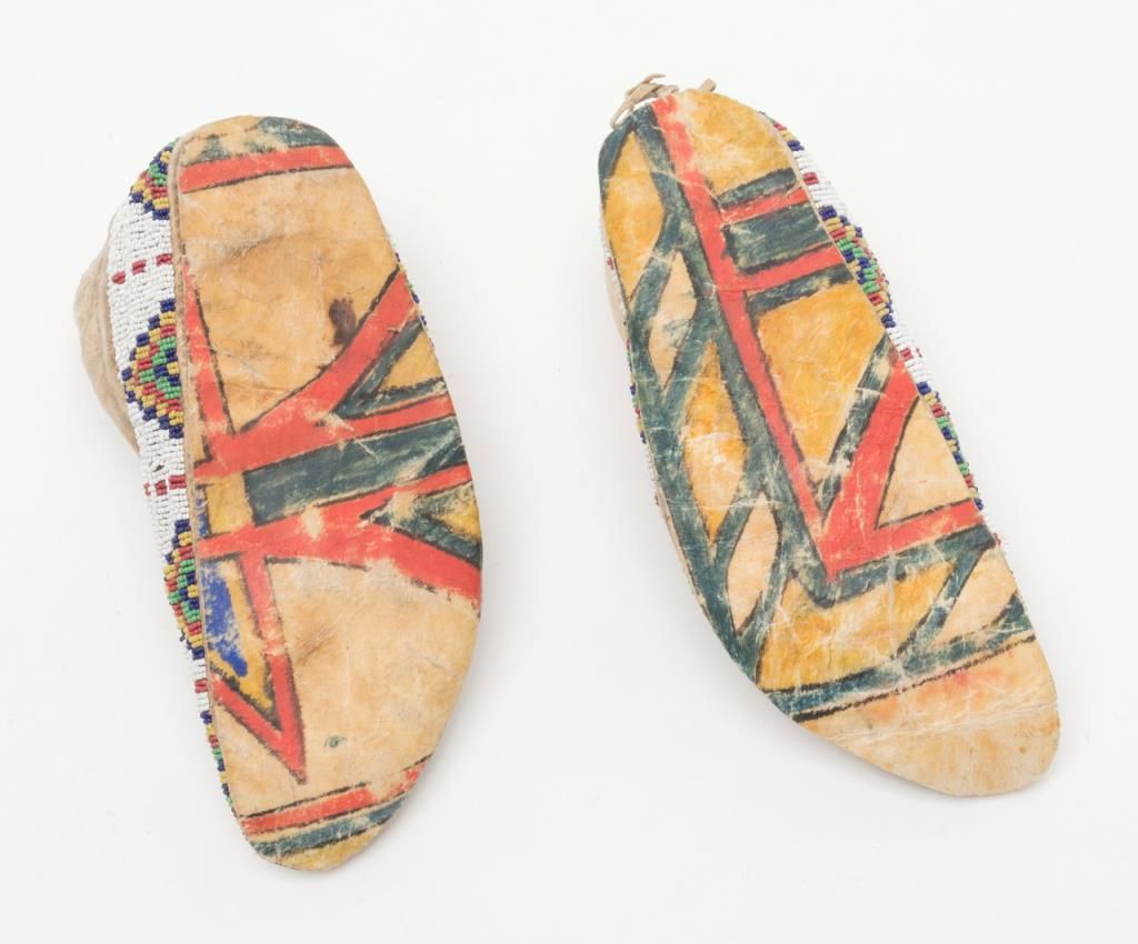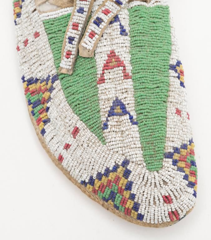 Pair of exceptional Sioux moccasins with parch fleche soles and intricate geometric details; a 9+ on 1-10 scale. Est.: $800-$1,600.