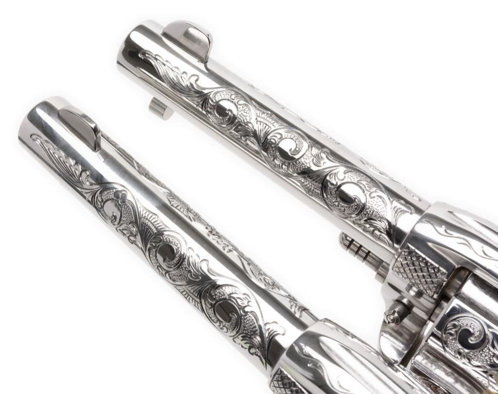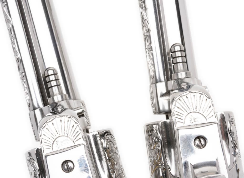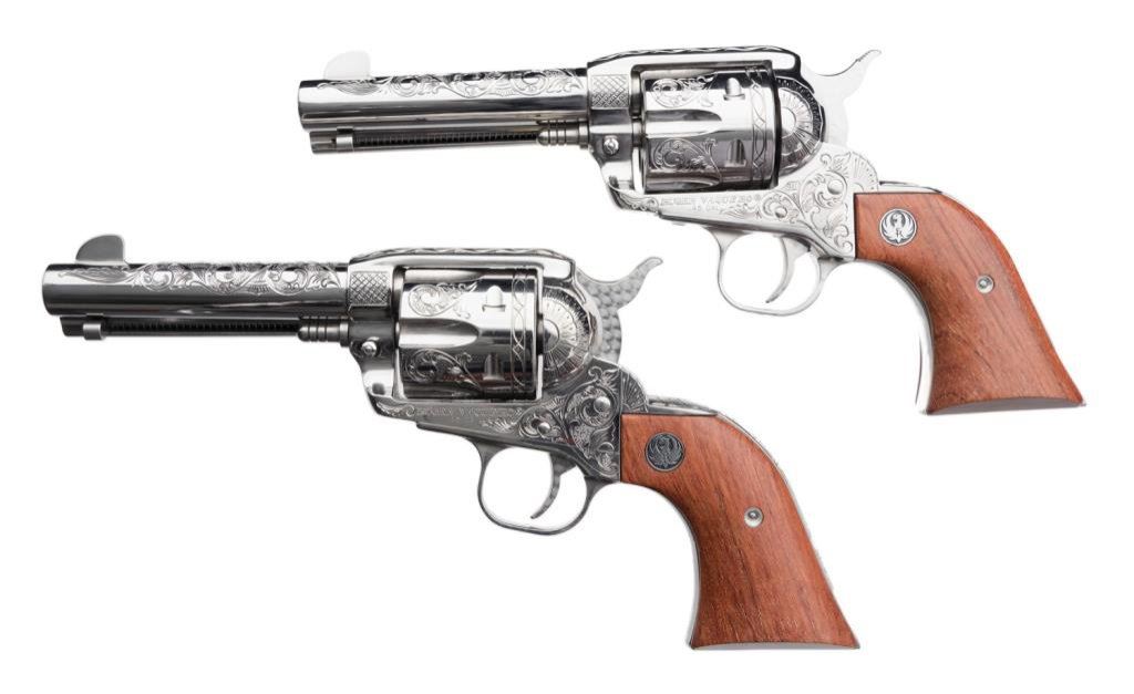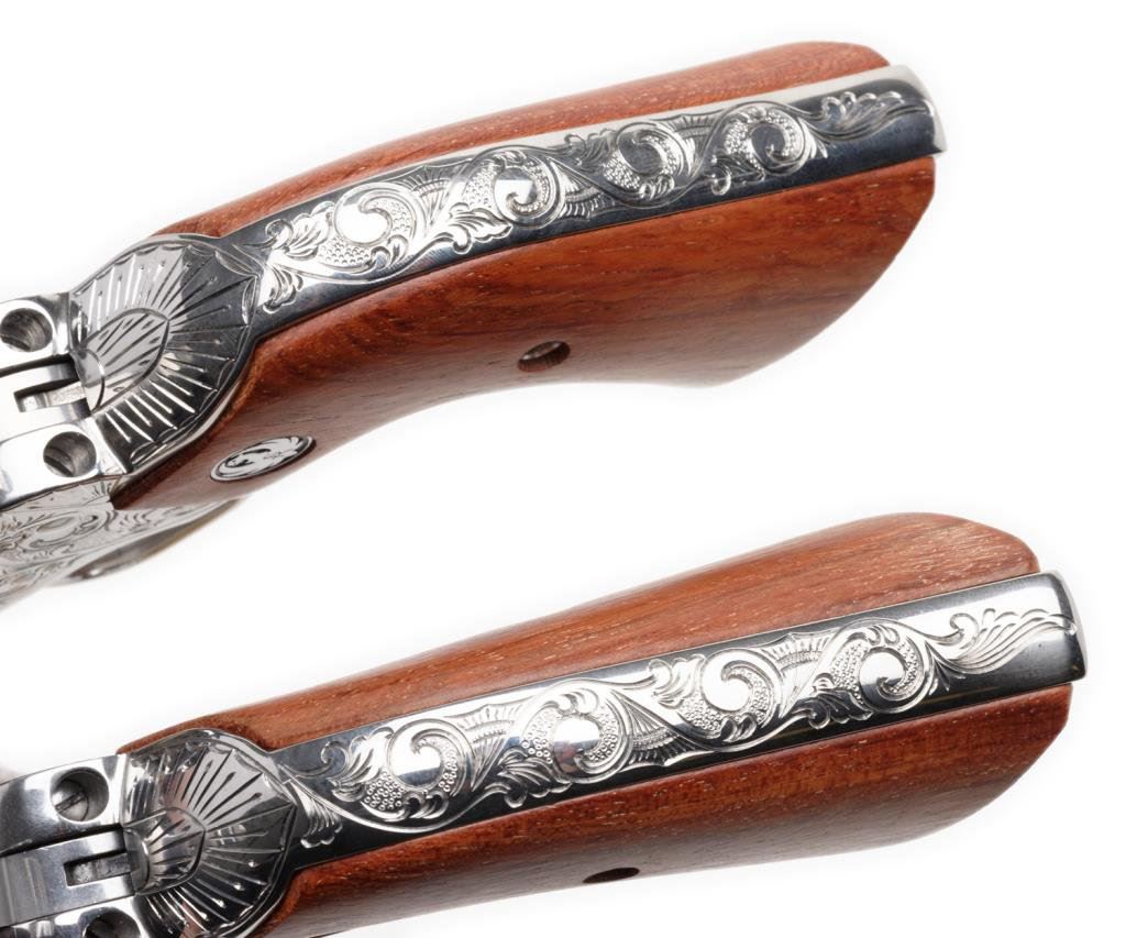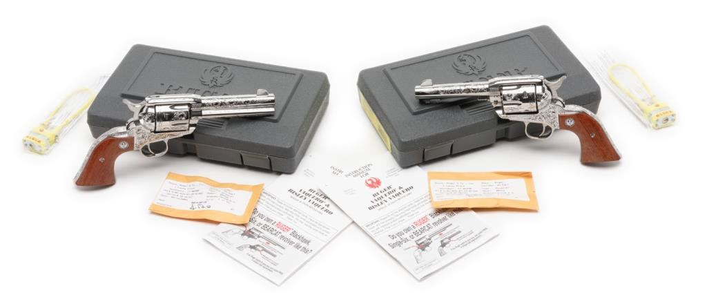 **Pair of exhibition quality custom engraved Ruger Vaquero Single Action revolvers by noted firearms engraver Jim Downey, both signed by Downey, .45 caliber, 4.75” barrels, consecutive S/Ns 58-86756 and 58-86757, bright nickel finish, smooth wood medallion grips; each accompanied by a Ruger grey hardcase, instructions and lock. This pair is in like new condition as customized, showing little handling. The engraving is masterfully accomplished and these are Downing’s signature pieces and featured on his business card. Accompanied by two photos and two Certificates from Downing. Est.: $2,500-$5,000.