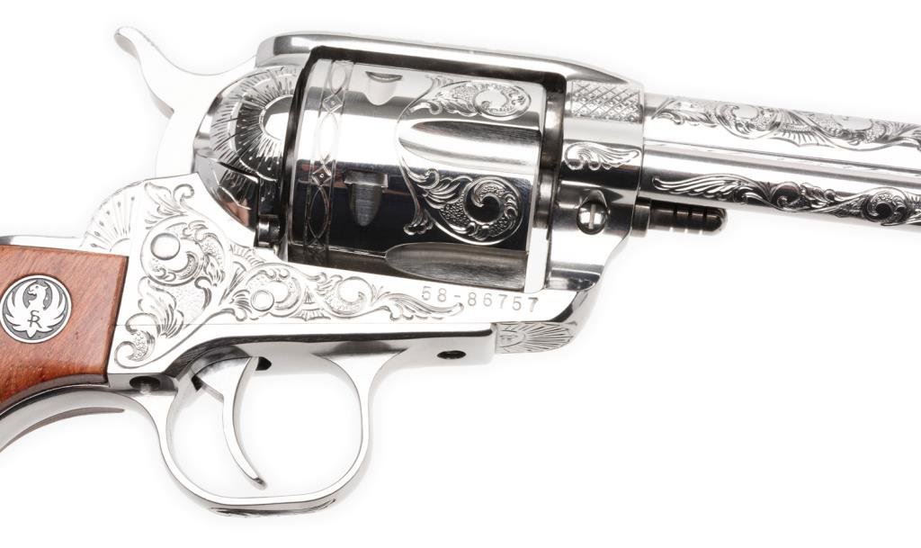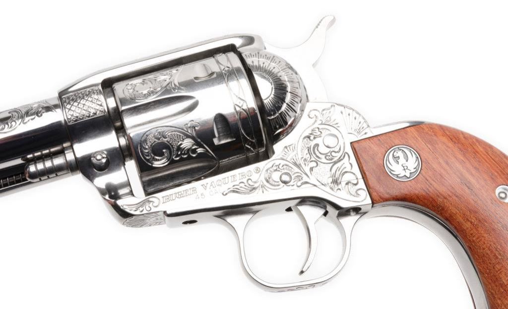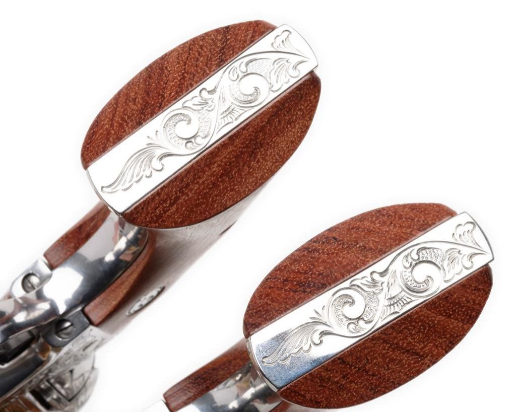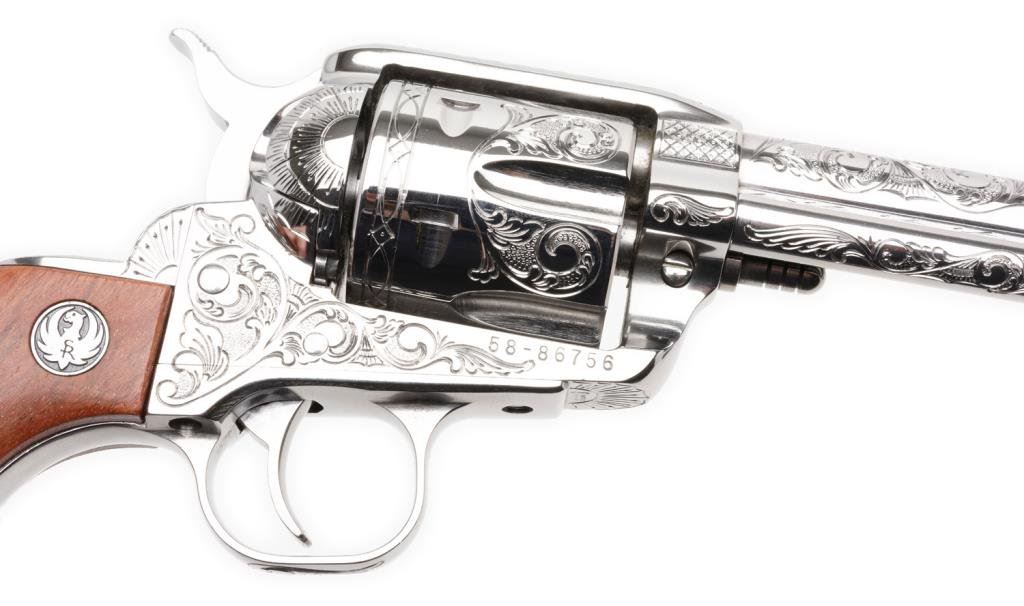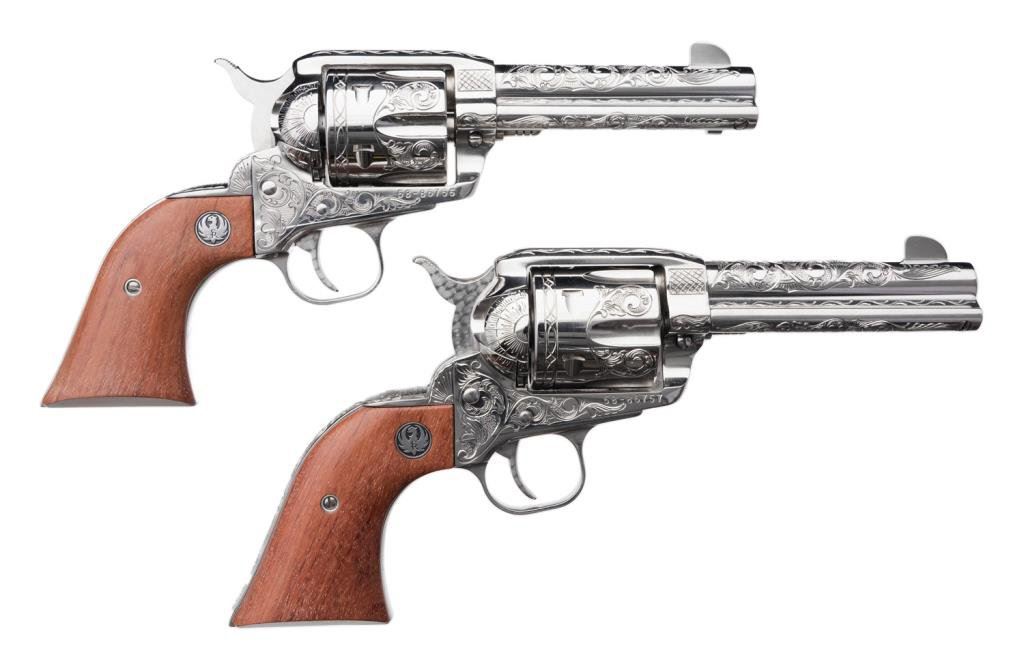 **Pair of exhibition quality custom engraved Ruger Vaquero Single Action revolvers by noted firearms engraver Jim Downey, both signed by Downey, .45 caliber, 4.75” barrels, consecutive S/Ns 58-86756 and 58-86757, bright nickel finish, smooth wood medallion grips; each accompanied by a Ruger grey hardcase, instructions and lock. This pair is in like new condition as customized, showing little handling. The engraving is masterfully accomplished and these are Downing’s signature pieces and featured on his business card. Accompanied by two photos and two Certificates from Downing. Est.: $2,500-$5,000.