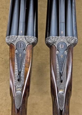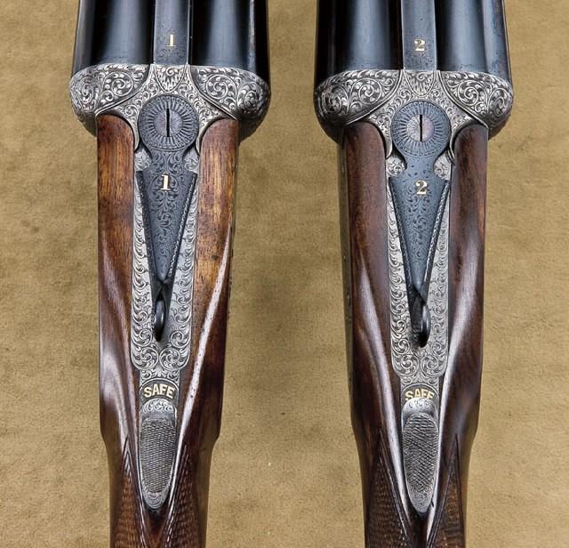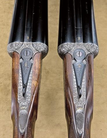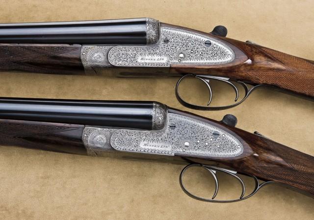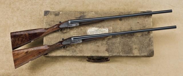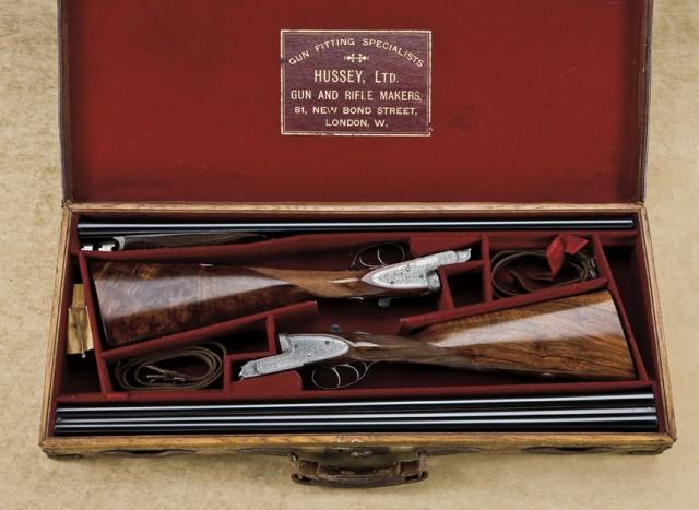 Pair of fine quality full side-lock double-barrel side by side shotguns signed Hussey, Ltd. of London in their original trunk-type carrying case with maker’s label in lid, serial numbers “12010” and “12011”. The pair are 12ga and show 29” barrels that are fully nitro proofed for 2-1/2 tons and 2-1/2” chambers (now lengthened to 2-3/4”). The pair are marked ‘patent ejector” and indeed show automatic ejectors, and are nicely English scroll engraved with select walnut stocking, crisply checkered wrists and forends with English style straight grip and checkered butts. The stocks measure approximately 15-1/4” from the front trigger to the end of the wood. The pair are professionally restored and show traces of original case hardening and gone to silver on gun number two, and faint traces of color on case hardening lightly polished to silver on gun number one. The barrels show 98% plus restored blue finish, and the stocks are excellent as refreshed. The actions are tight, the bores are fine to near excellent, the case is in very good plus condition, and shows embossed Moroccan leather label with Hussey’s New Bond Street address. English side lock guns of this quality are