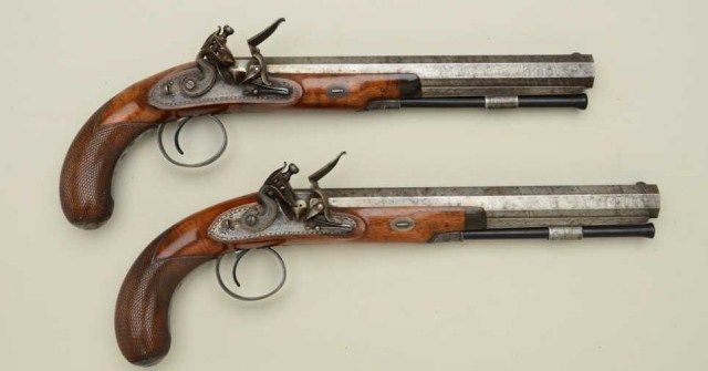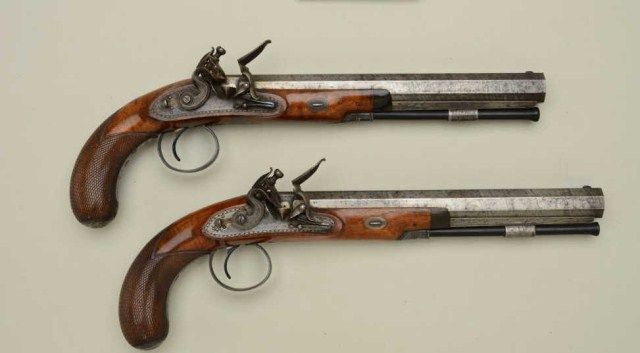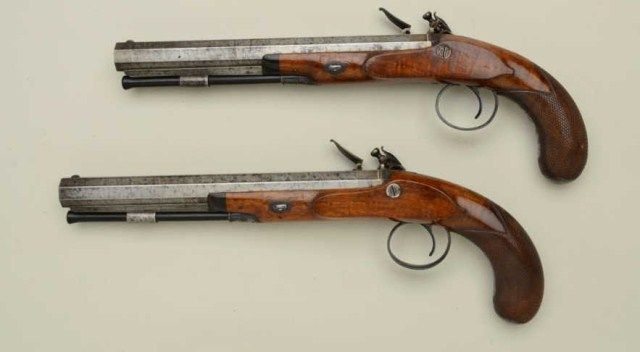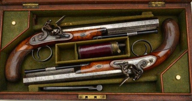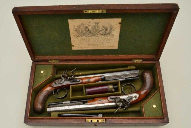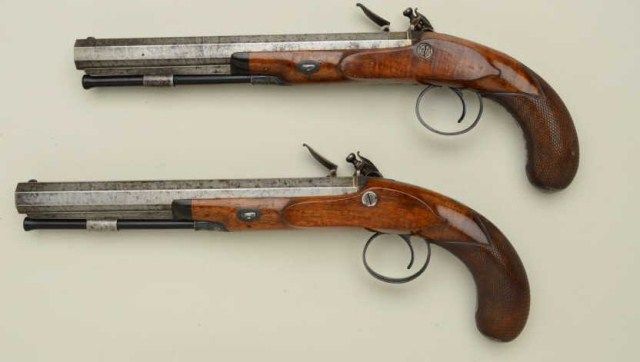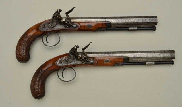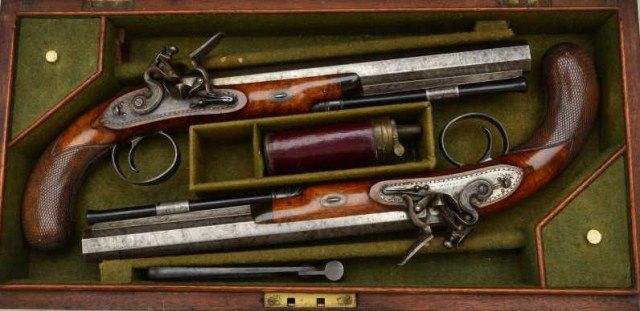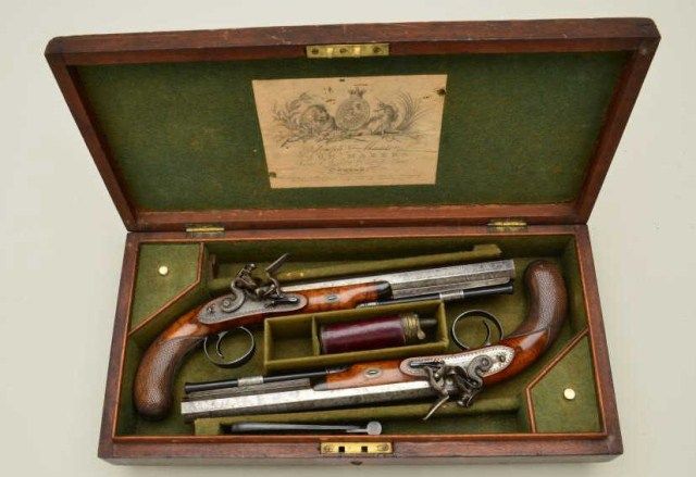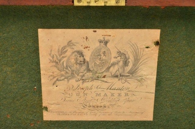 Pair of flintlock dueling pistols by Joseph Manton in their original case with accessories remaining in very good untouched condition from and old Pasadena Collector’s Estate. The pistols measure 15-1/2” overallwith 9-7/8” slightly heavy weight octagon barrels of .50 caliber smooth bore. The pair in very good condition showing a light gray patina on barrels with strong traces of original striped pattern. The locks show 50%plus original case hardening with all original parts. The tangs also show 75% plus case hardening. The stocks are very good plus to near fine with just some minor scratches in their original varnish. The trigger guards show 10%-20% drifting original blue with bright blue on triggers. The trigger guards show an engraved #4751. The pistols retain correct style (possibly the original rods) and they are crisp overall. The original case is in very good plus condition showing full original label in lid which reads, “Joseph Manton, Gun Maker, Davies Street & Berkley Square, London. Patentee for the Breeching of guns, hammers of locks, inventor of Platina