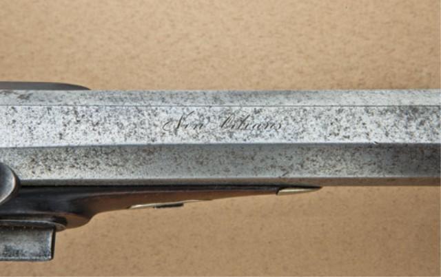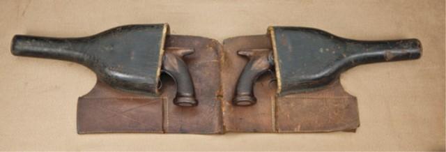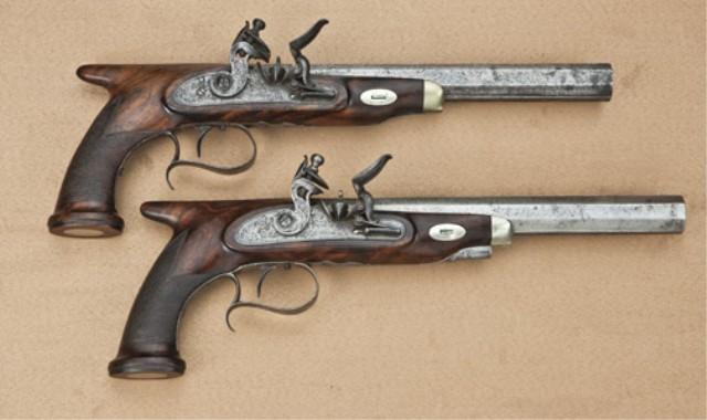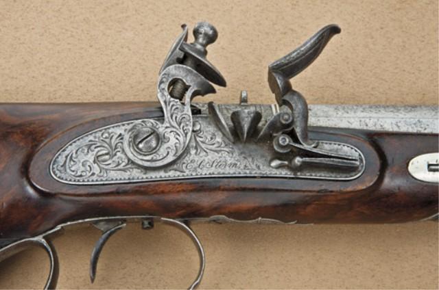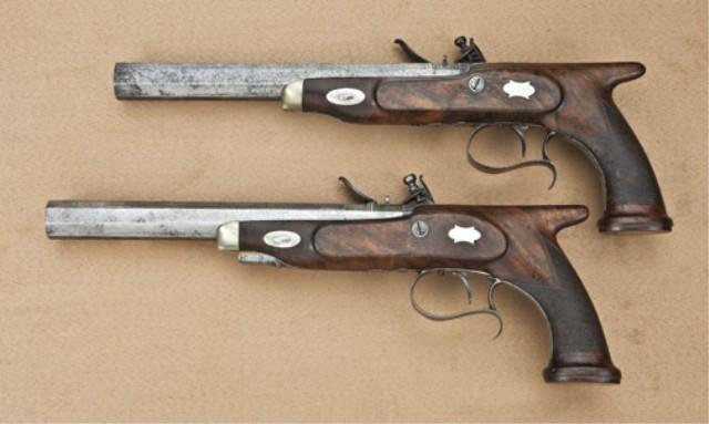 Pair of flintlock dueling pistols signed “E.C. Storm” on locks, New Orleans on barrels, approx. 15” overall with 8-1/2” heavy octagon barrels of approx. .54 caliber smoothbore. The pair are nicely engraved in script E. C. Storm on locks, and same script New Orleans on barrels. The pistols are half-stocked, and show engraved iron triggerguards, saw-handled grips, with squared butts. They are nicely checkered at the wrist and show adjustable set triggers. The pistols show gold and platinum bands at breech and platinum blowout plugs. They have been mounted with v-notch rear sides, and blade post German silver front sights which are of the period. The pair show German silver escutcheons, forend caps, and oval inlays in butt. One pistol is missing its rear ramrod pipe and is worn down there and the rods appear to have been removed long ago, possibly for better balance. The metal surfaces show light to moderate scattered erosion and pinprick pitting, some slightly heavier pitting at the breech and muzzles. One barrel shows some cleaning long ago. The locks have fared better than the barrels and show considerable case hardening within a patina. The locks are in their original flintlock