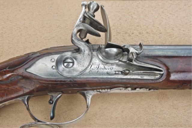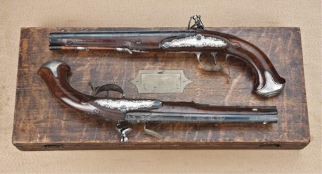 Pair of flintlock holster-size pistols signed J. Andres Kuchenreuter on barrels and locks, silver mounted, period cased in English style partition case. The pair are approx. .50 caliber smoothbore with 10-3/8” round barrels with octagon top flap. Full stocked to the muzzles, adjustable set trigger, folding sights at breech fancy silver inlaid barrels, with Kuchenreuter riding a horse maker’s cartouche. Barrels show most of their fire-blued finish. The left side of the breeches are stamped with a false proof and there is a large “EX” engraved in front of Kuchenreuter’s name. The locks are bright polished and in their original configuration and show some slight cleaning, minor erosion and pinprick pitting. The stocks are very good plus with nice carving at the tangs in florals, molding around the mounts, and good quality throughout, just some minor scratches, marks in the varnish, and slight wear. The original horn forend caps and horn tips are included. One forend shows a break and expert repair. The pistols are mounted in heavy silver, probably coin silver or 800 fine. The pistols are contained within their original to the period English style agented case with green felt