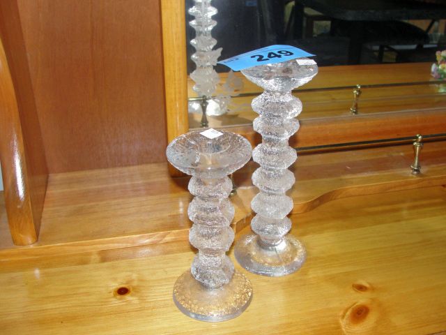 Pair of glass candle holders, signed TS on bottom