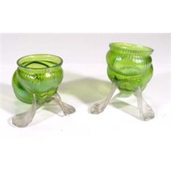 Pair of green iridecsent glass shell vases, with frosted glass feet, 11cm high