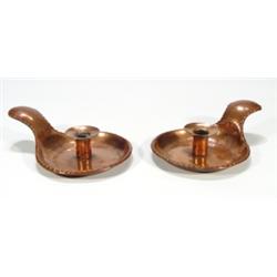 Pair of hammered copper Arts & Crafts chamber sticks, 22cm long