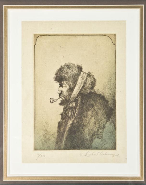 Pair of hand-pulled original etchings by noted western artist Michael Coleman of trappers. Both hand-signed and numbered 2 of 25, colored by artist. Measuring approx. 8”h by 6”w (artwork). Nicely framed and matted.Est: $750 - $1,500