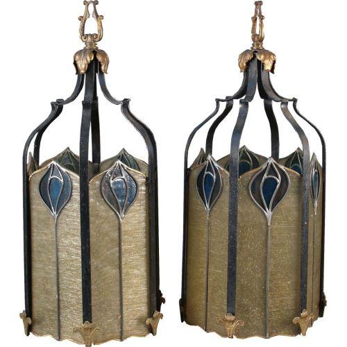 Pair of hanging Light Fixtures Iron w/ Leaded Glass 25 " tall