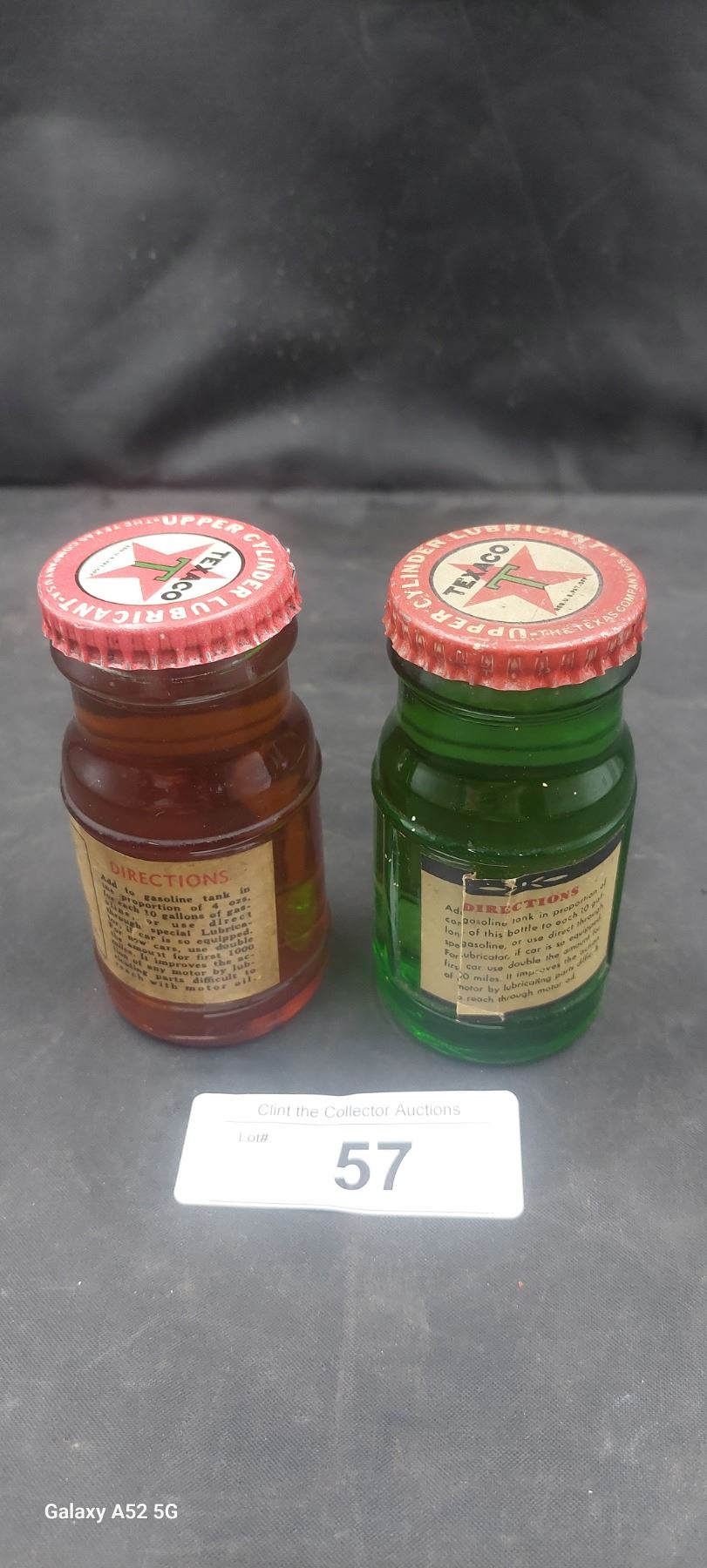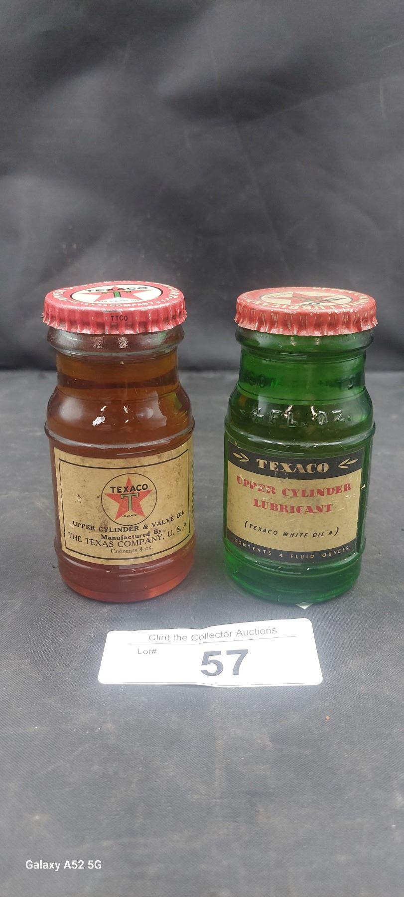 Pair of hard to find antique Texaco Cylander Lubricant 4oz bottles, paper lable