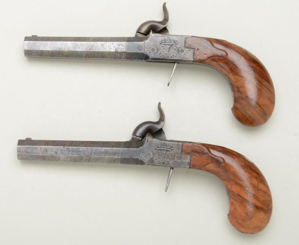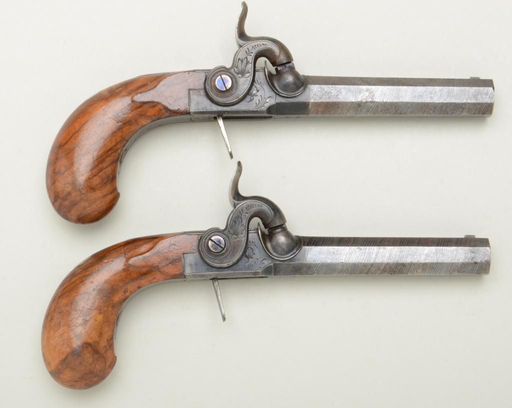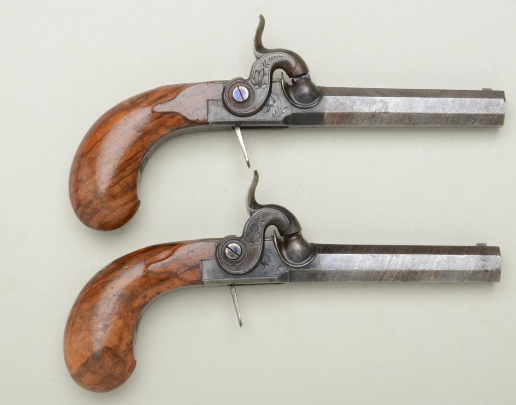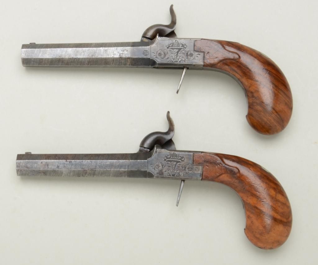 Pair of high quality Belgian side hammer folding trigger muff type pistols in fine condition, showing AF stamp on bottom of barrel, "August Francotte", with Belgian proofs, #46. The pair measure 8-1/4"overall, with 3-1/2" medium weight octagon barrels of approximately .48 cal. smooth bore. The barrels show a brown striped finish, the locks, hammers and frame are case hardened. The pistols have retained 85-95%of their rich original finishes, just starting to tone and age. The grips are a select fruitwood with a matched grain. There a few storage marks and scratches, but the condition is very good+ to nearly fineoverall. The frames are nicely engraved with scrolls and a cornucopia on left side. Francotte was one of the top European makers in his time. Est.: $1,000-$2,000