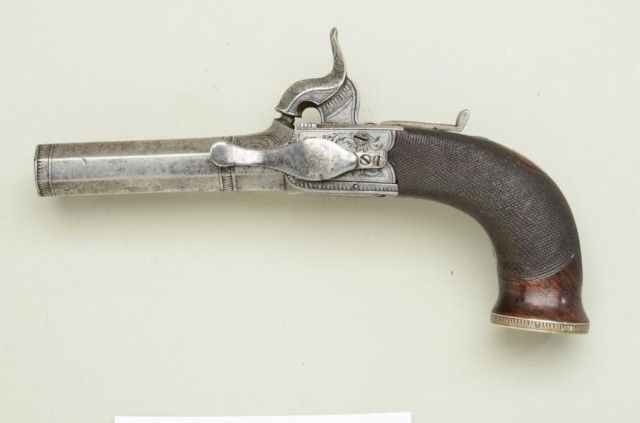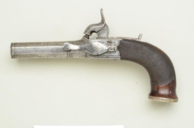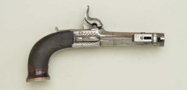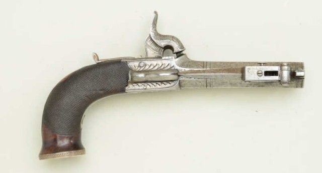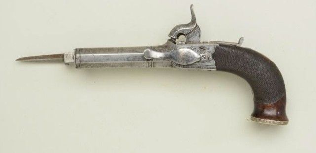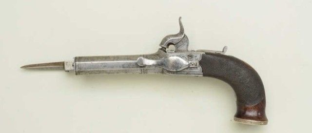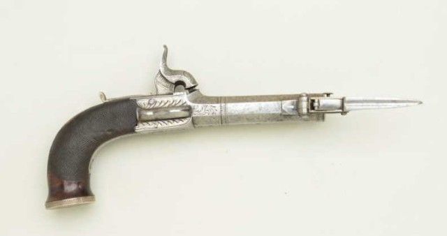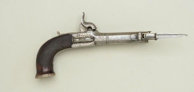 Pair of high quality English center hammer percussion pistols with side mounted spring bayonets, signed Mayes, Norwich. The pair measure 7 ½” overall with 2 ¾” octagon barrels of approximately .50 caliber falserifled. The pair are numbered 38 on the bottom of each breech and show British proofs. The grips are nicely checkered and show a silver band around butt and plaques inscribed “Lowestoft” in fancy script. Thereis a belt hook attached to left side of each frame and also a plaque at each wrist is inscribed in matching script to the butt (W. Balls) most likely the original owner who resided in Lowestoft? The metal surfaces arein good condition with a light gray to brown patina showing some pitting and erosion. The engraving is sharp and edges crisp. Stocks are very good plus with just a few minor bumps and mars. Both actions are working.Last sold Richard K. Bourne auctioneer for James Elwood Jones Collection 1981. From an old N.Y. Collector’s Estate. Est.; $1,000-$2,000