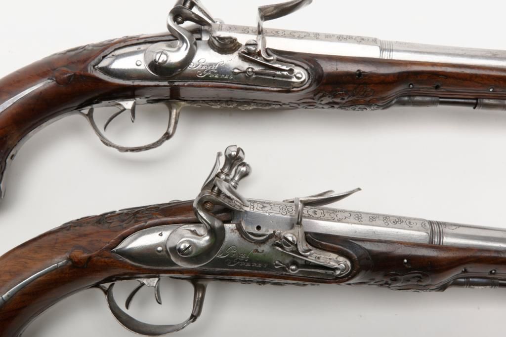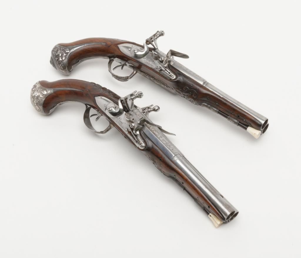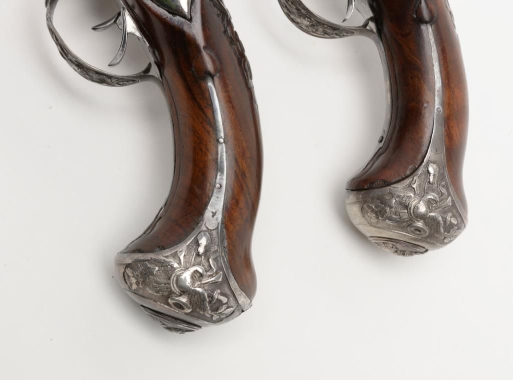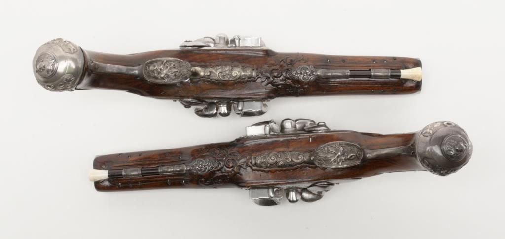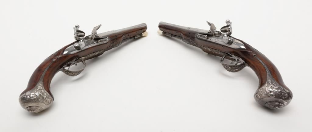 Pair of high quality fancy silver mounted double barrel flintlock pistols signed “Penet (Bros.) a’, St. Etienne”. The pistols measure 14” overall with a 7 ½” barrels of approximately .62 caliber smoothbore. The pair have been professionallycleaned to a bright Museum quality finish showing sharp edges and well defined engraving and metal surfaces (Not rubbed out). The pair are in their original flintlock configuration with correct hammers and parts. The stocks have been lightlyrefreshed and also show good sharp raised carving and good surfaces. The pistols are ornately mounted with cast silver mounts showing Grecian and military designs along with small French hallmarks. Double barrel pairs of flintlockpistols are scarce but particularly rare and desirable when finely silver mounted. We would date this fine set at about 1760-1780. Est.: $7,000-$14,000