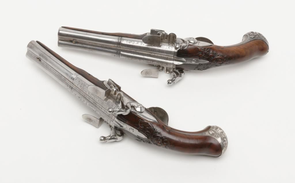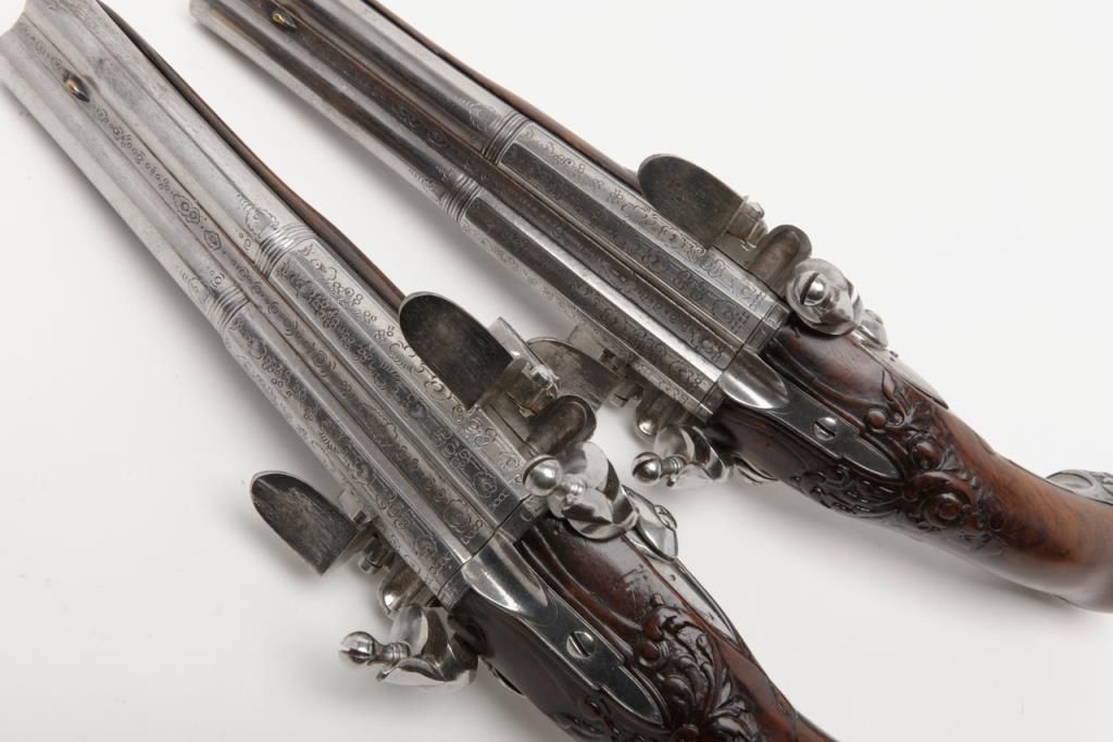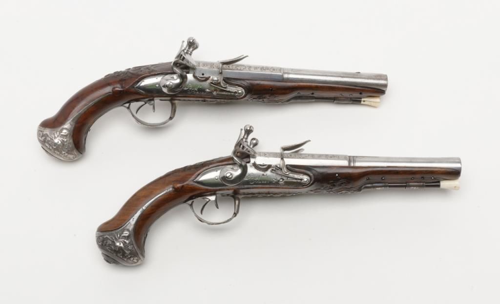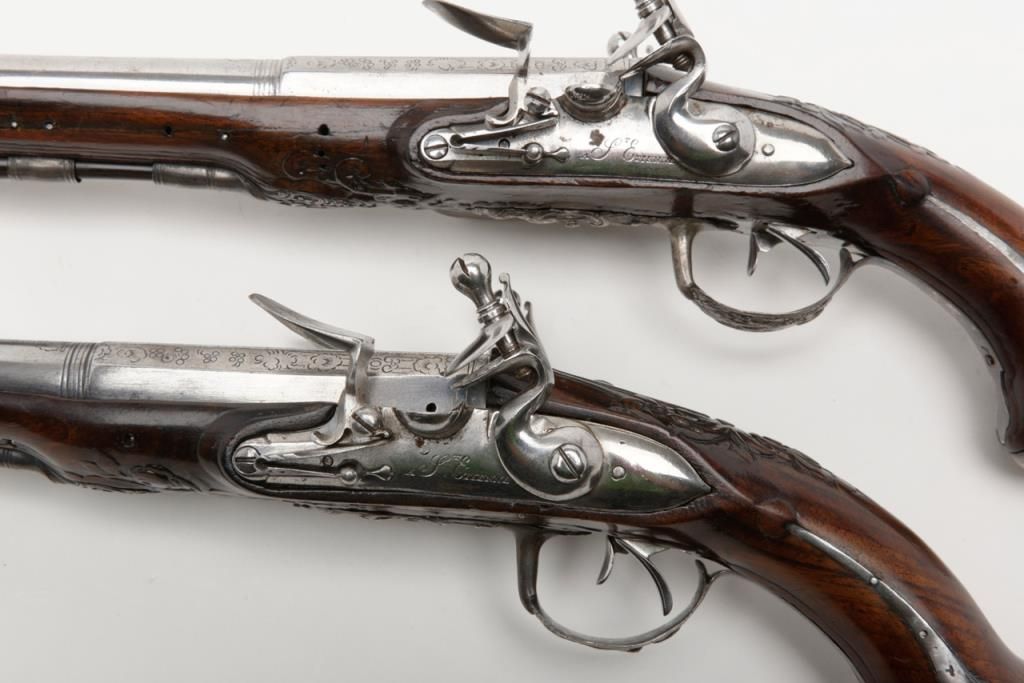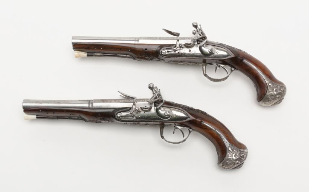 Pair of high quality fancy silver mounted double barrel flintlock pistols signed “Penet (Bros.) a’, St. Etienne”. The pistols measure 14” overall with a 7 ½” barrels of approximately .62 caliber smoothbore. The pair have been professionallycleaned to a bright Museum quality finish showing sharp edges and well defined engraving and metal surfaces (Not rubbed out). The pair are in their original flintlock configuration with correct hammers and parts. The stocks have been lightlyrefreshed and also show good sharp raised carving and good surfaces. The pistols are ornately mounted with cast silver mounts showing Grecian and military designs along with small French hallmarks. Double barrel pairs of flintlockpistols are scarce but particularly rare and desirable when finely silver mounted. We would date this fine set at about 1760-1780. Est.: $7,000-$14,000