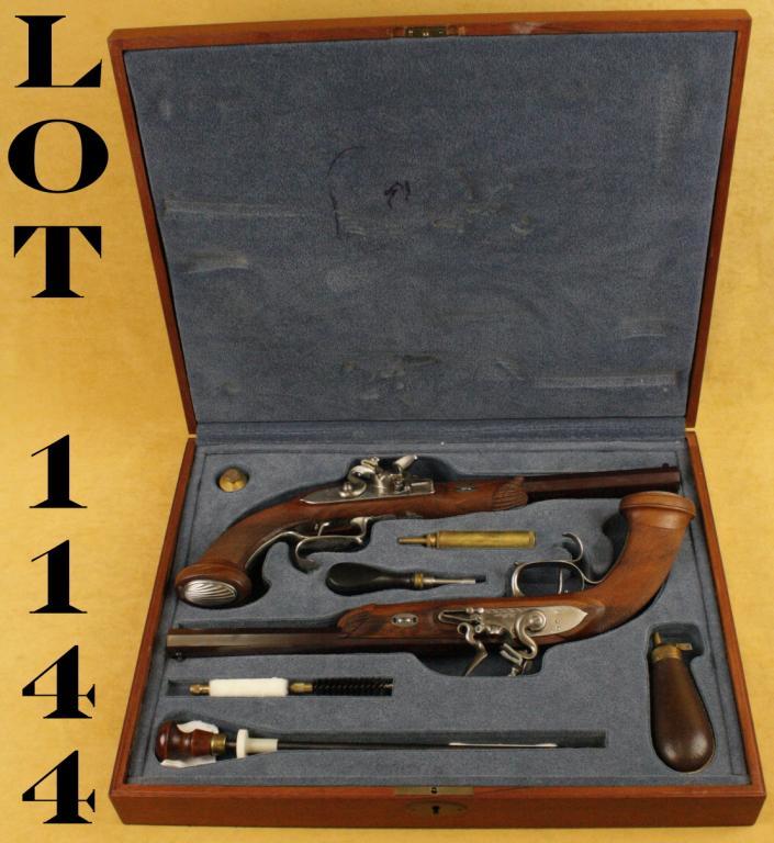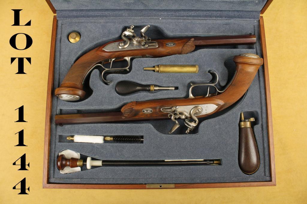 Pair of high quality flintlock dueling pistols, contemporarily made in the style of LePage cased with accessories. Approx. .45 caliber bores. Excellent condition, set triggers, empire period styling, Italianmade. Serial #F02684 and F02677. Purportedly imported by Val Forgett of Navy Arms in the early 1980’s, who sponsored America’s blackpowder shooting teams. Est: $700- $1,400