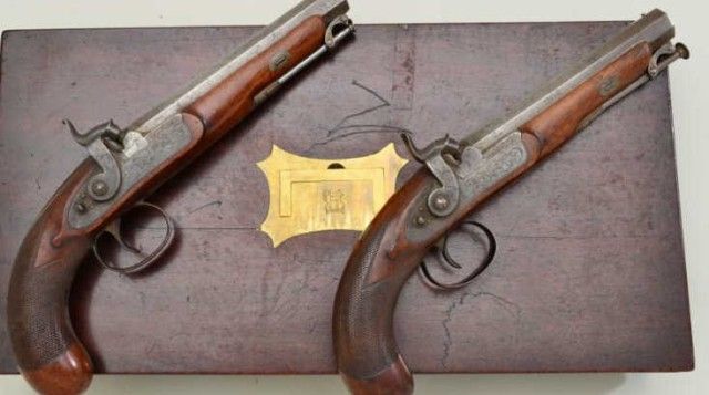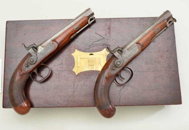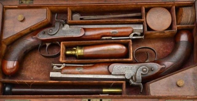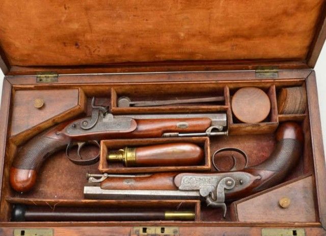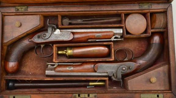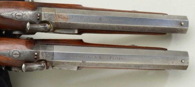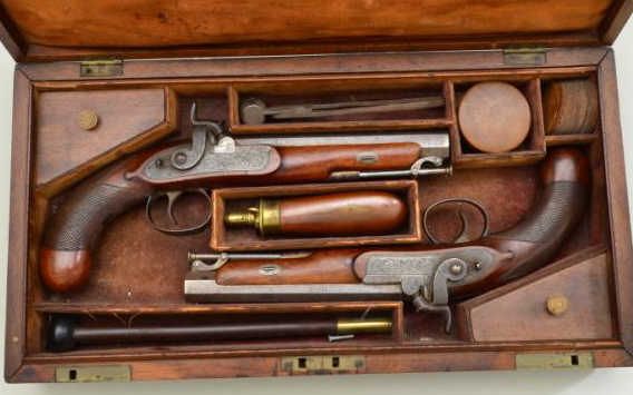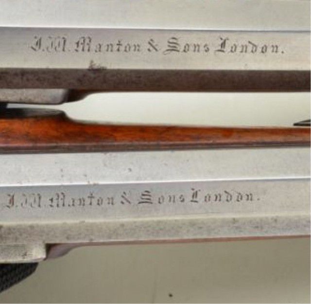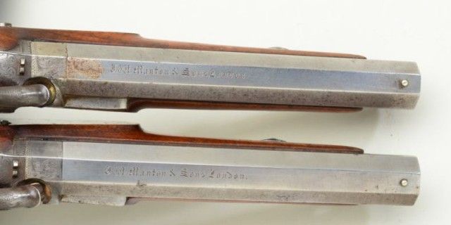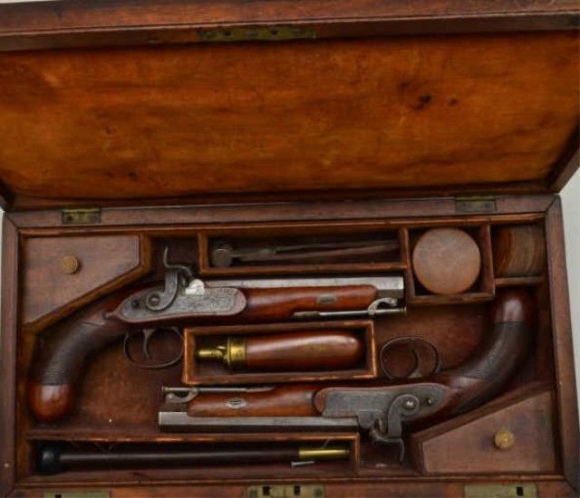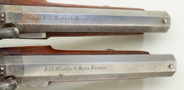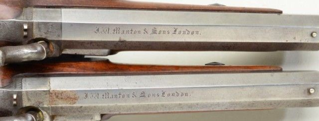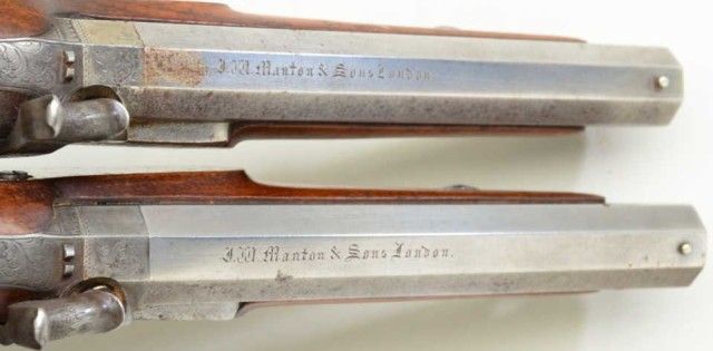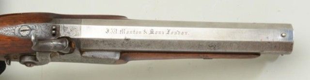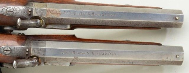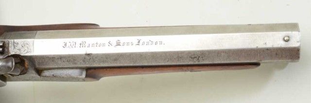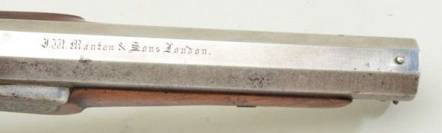 Pair of high quality percussion Officer’s type pistols signed J. Manton & Sons, London. In their original case with accessories showing engraved crest on lid. The pistols measure 12 ½” overall with 6 ¾” medium weight octagon barrel of .60 caliber smooth bore with swivel ram rods. The pair shows nicely engraved locks and mounts. The metal has been cleaned to bright on barrels, traces of case hardening on locks. The socks are very goodplus with crisp edges and checkering. The stocks show minor dings and scratches but most of the varnish is retained. Both trigger guards show some blue and there is some light surface rust from poor storage. Thecase is in good condition with some normal fading, fraying and impressions from contact. A Sykes patent bag flask in very good condition is included along with proper mold, rod, accessory box and two (2) correctcompartment covers. The exterior of the case is dark stained oak with brass mounts in good condition with some normal staining and aging. The plaque inlaid into lid double as a carrying handle and is engraved with a lion