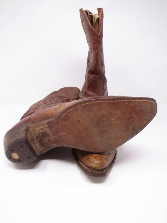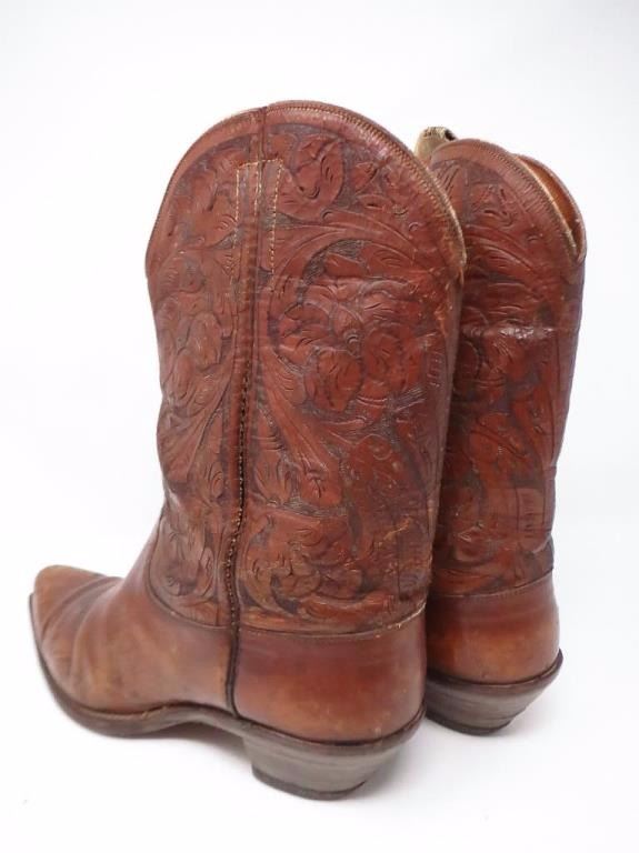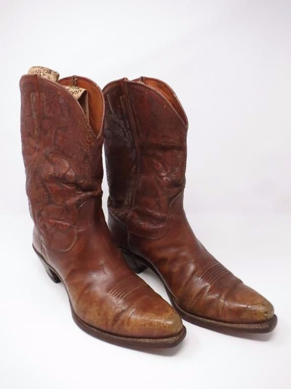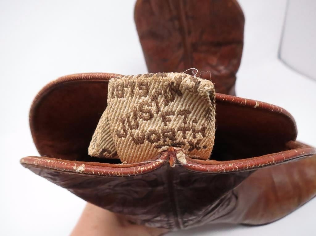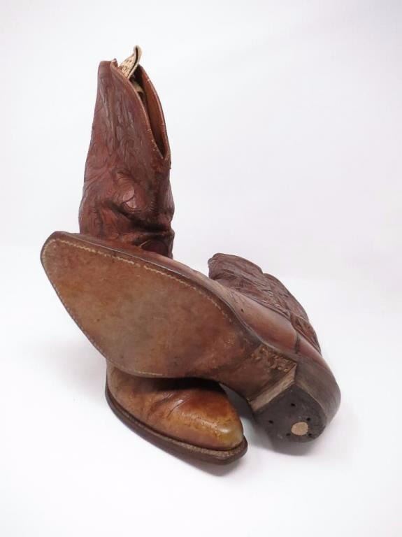 With carved leather tops, pegged shanks, and canvas pulls. A few minor cracks in the surface.