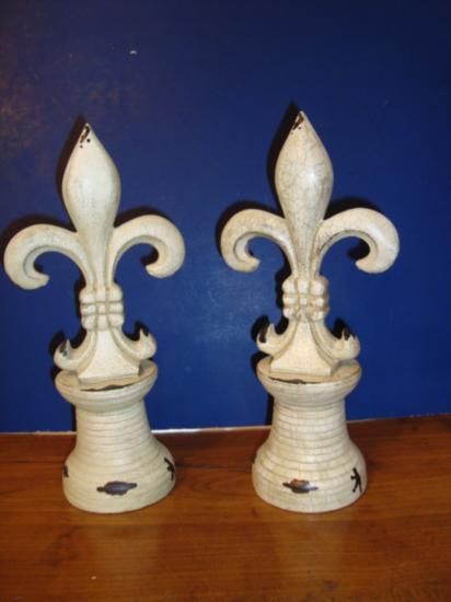 Very nice pair of large painted French Fleurs de Lys, excellent for decoration, book-ends... The English translation of "fleur-de-lis" (sometimes spelled "fleur-de-lys") is "flower of the lily." This symbol, depicting a stylized lily or lotus flower, has many meanings. Traditionally, it has been used to represent French royalty, and in that sense it is said to signify perfection, light, and life. Legend has it that an angel presented Clovis, the Merovingian king of the Franks, with a golden lily as a symbol of his purification upon his conversion to Christianity. Others claim that Clovis adopted the symbol when waterlilies showed him how to safely cross a river and thus succeed in battle. We ship from Texas (not from France)! h-11"/ w-5"/ d-3.5"