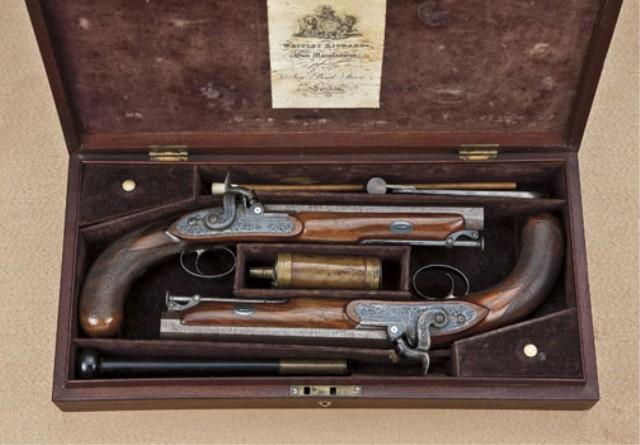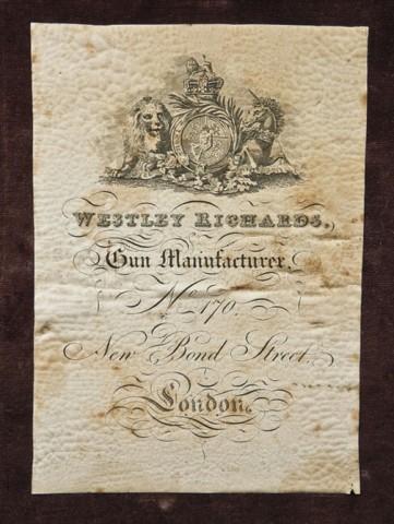 Pair of large bore percussion pistols by Wesley Richards of London in fine to excellent condition, contained within their original case. The pair measure 13-3/4” overall with 8” barrels, approx. .67 caliber, are full stocked to the muzzles with swivel ramrods. The pair show 85-95% original striped brown finish with just some light areas of beginning erosion and pinprick pitting just starting. The locks, tangs, and hammers show 75-85% case hardening that is still fairly bright. The triggerguards show 50-60% bright original blue. The stocks are near fine with sharp checkering and 90% original varnish. The pair show silver escutcheons around the barrel keys and bright blue on the keys. Both the barrel and locks are signed and the pair are near fine condition overall. The case is lined in purple velveteen with full maker’s label in lid. The interior of the case is also near fine with just some minor impressions. A correct mold, rods, English style flask, and compartment covers with bone pulls and one compartment contains wads and original key. The label shows just some slight staining and is intact with #170 New Bond St address. The exterior of the case is very good plus with just some