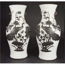 Pair of large grey crackle glazed Japanese vases with applied peacocks amongst flowers, mark to base, 46cm high