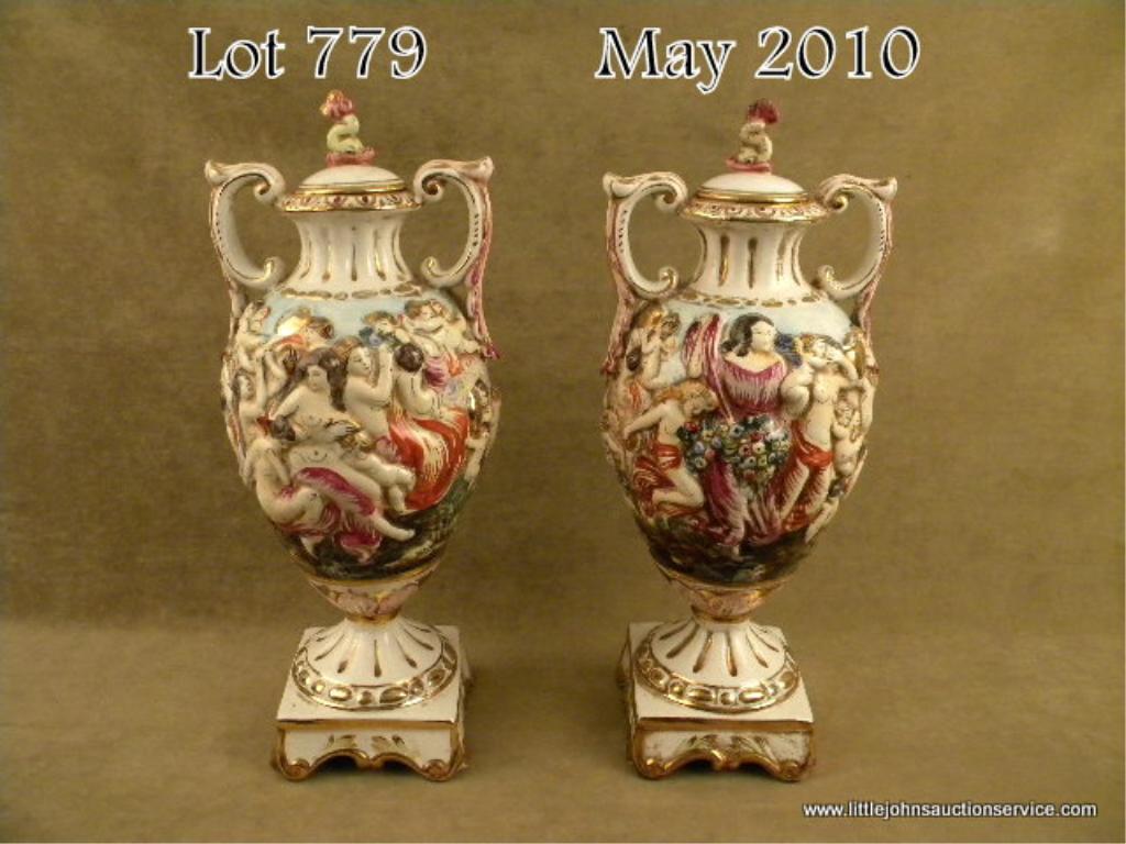 Pair of large matched Capodimonte porcelain vases approx. 19” high and approx. 7” at widest points on integral bases with removable ornate tops in overall excellent condition at time of description showing raised women and little angels with ligh blue, rose, red, tan, ivory and black coloring with gold trim and bordering. The underside of the vases are marked “Capodimonte, Italy, 2188” with five lines over N symbol. A beautiful pair. Est.: $250-$500.