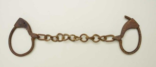 Pair of large old Tower style leg irons that have seen lots of use and are uncleaned; no key; great display piece. Est.: $200-$400.