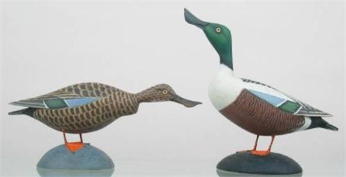 Pair of larger miniature shovelers with split tails and painted eyes. "Shoveler" on Drake and "Shoveler Hen" on hen along with "James Lapham, Dennisport, Mass" on the bottom of both. (decoy)