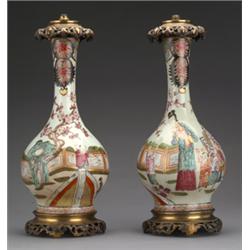 Pair of late 18th/early 19th Century Chinese porcelain lamp bases decorated with figures and with ormolu mounts, 35cms high