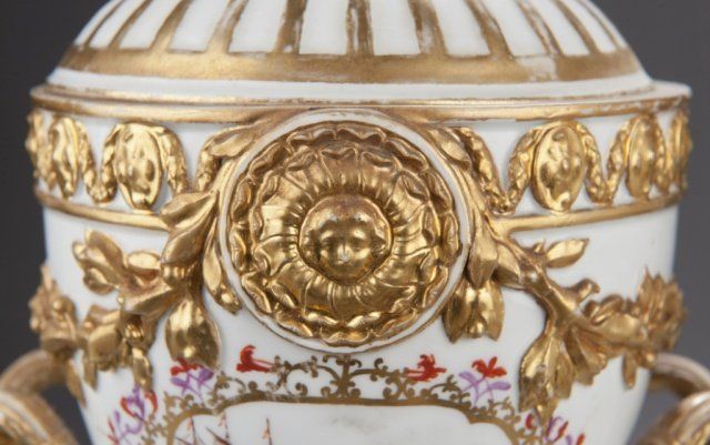 Pair of gilt hand painted Meissen Germany lidded urns. Late18th/early 19th century. With central painted plaques of ships and figural scenes. With crossed swords and star mark above two vertical lines on bottom. 12"h x 7 1/2"w x 6 3/4"d.