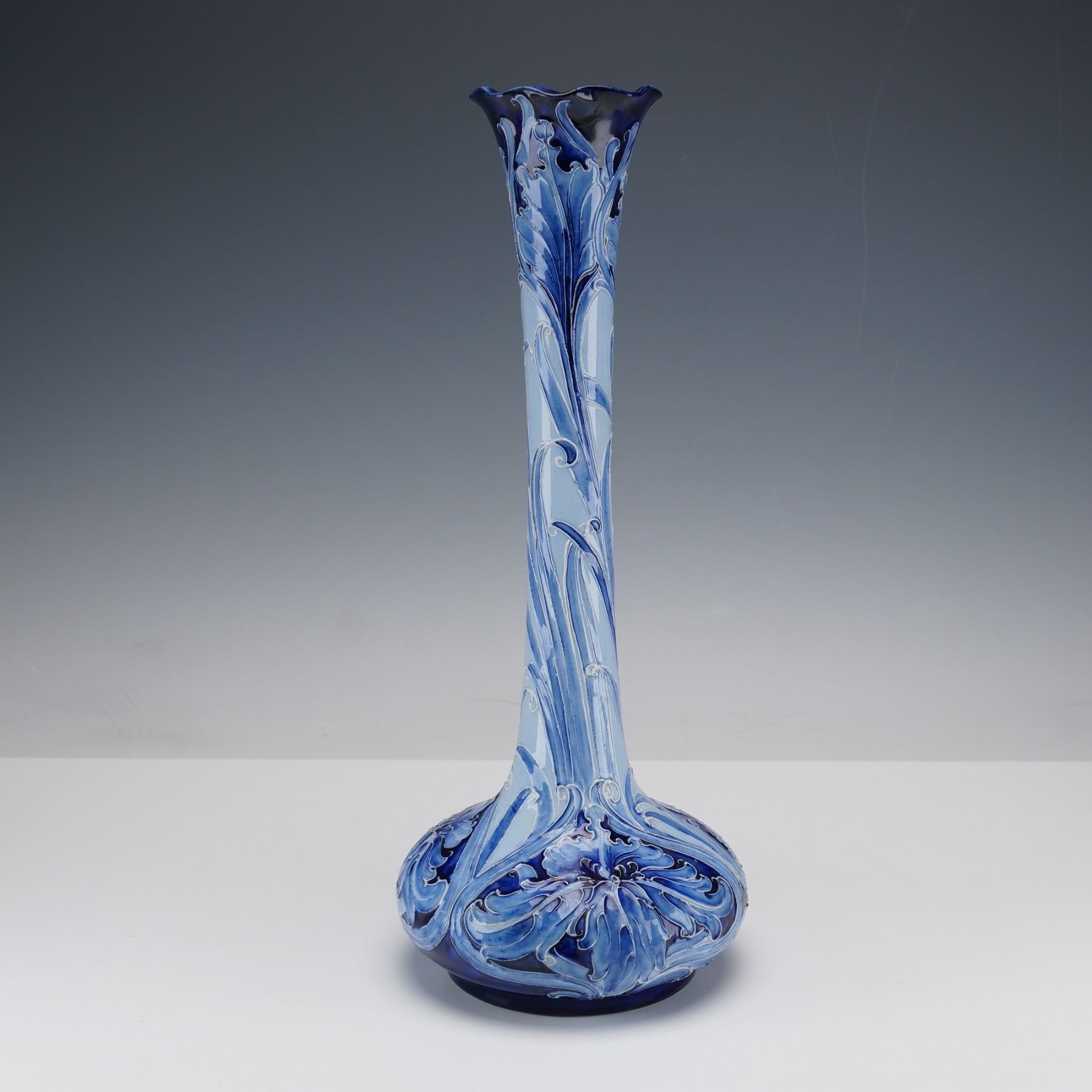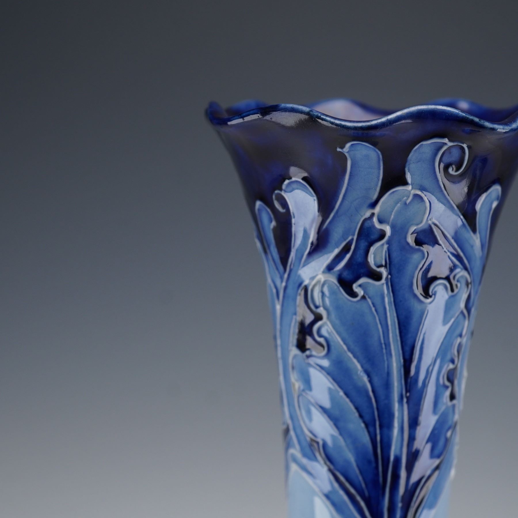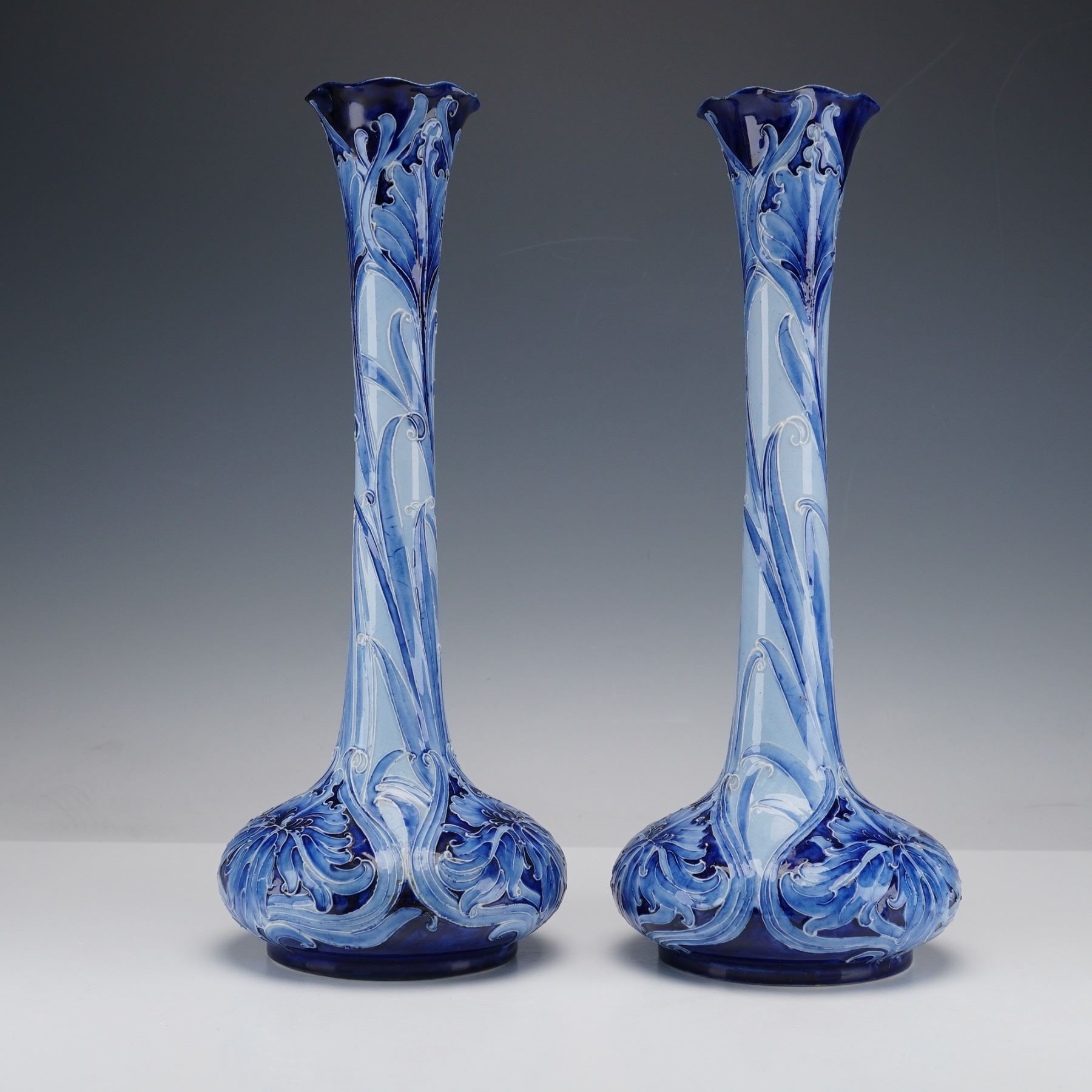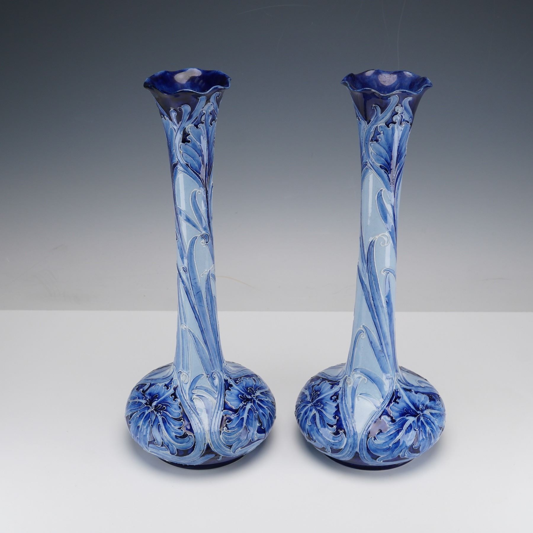 Pair of Macintyre Moorcroft Florian Cornflower Vases, c.1900. the shallow tall tapering stems with frilled borders tube lined and decorated with flowerheads and leafage in varying shades of blue. Printed brown mark No. M1057 with written signature in green.