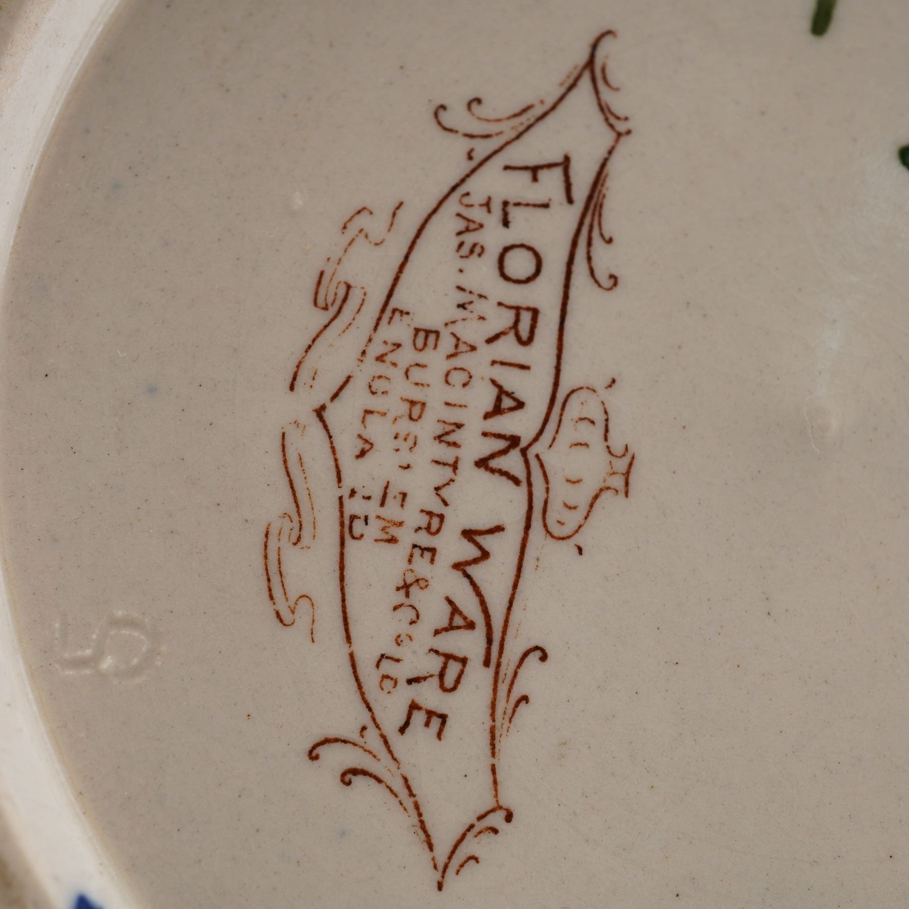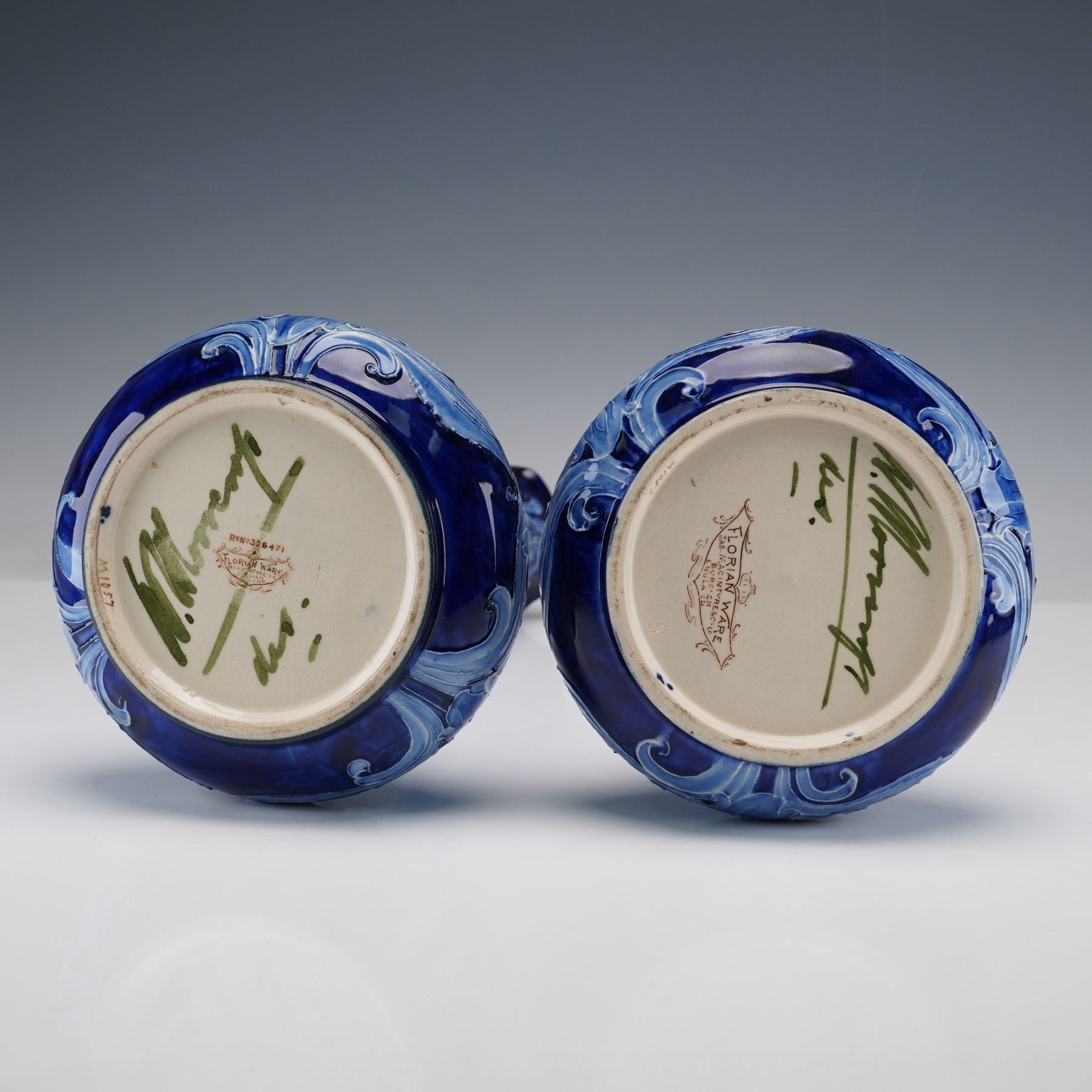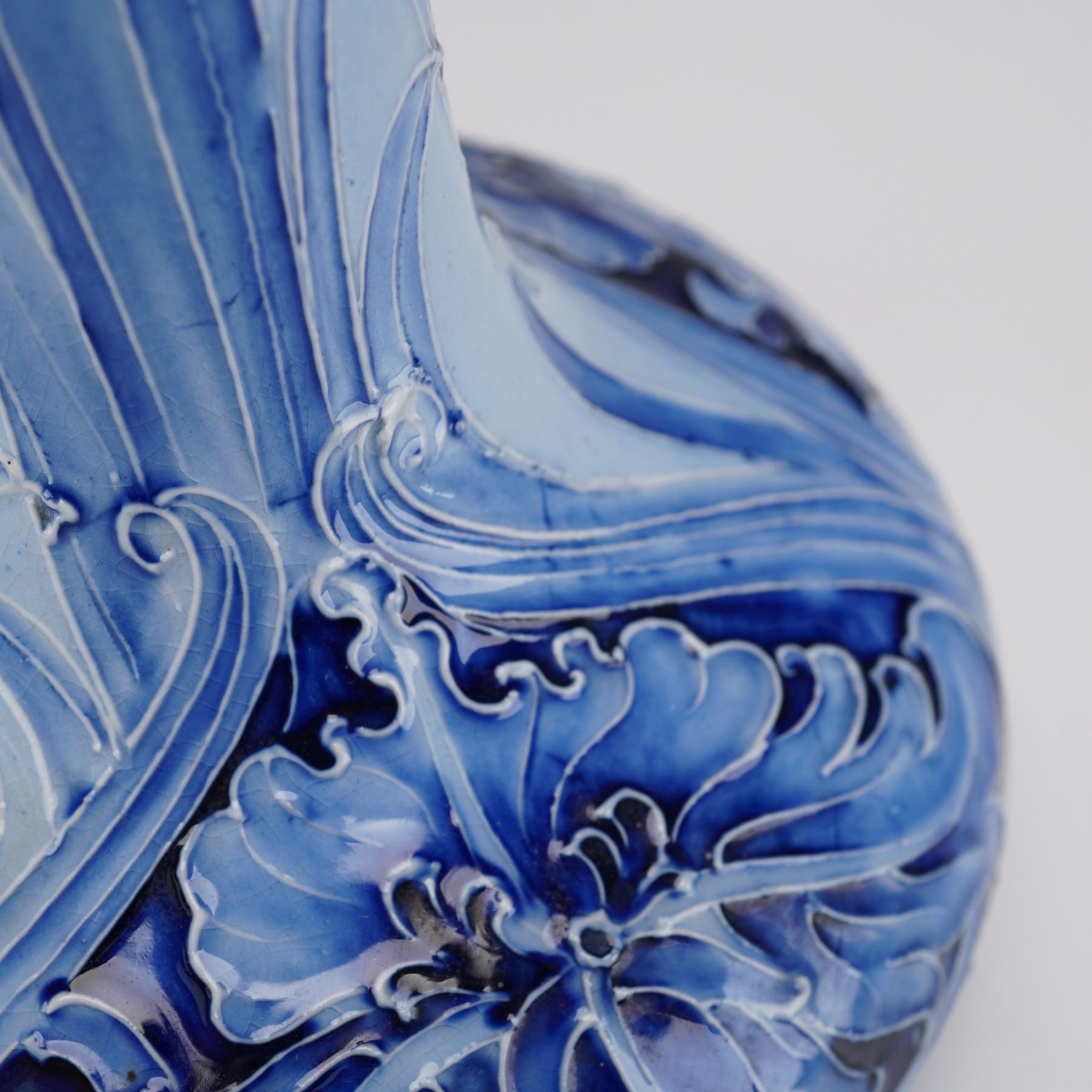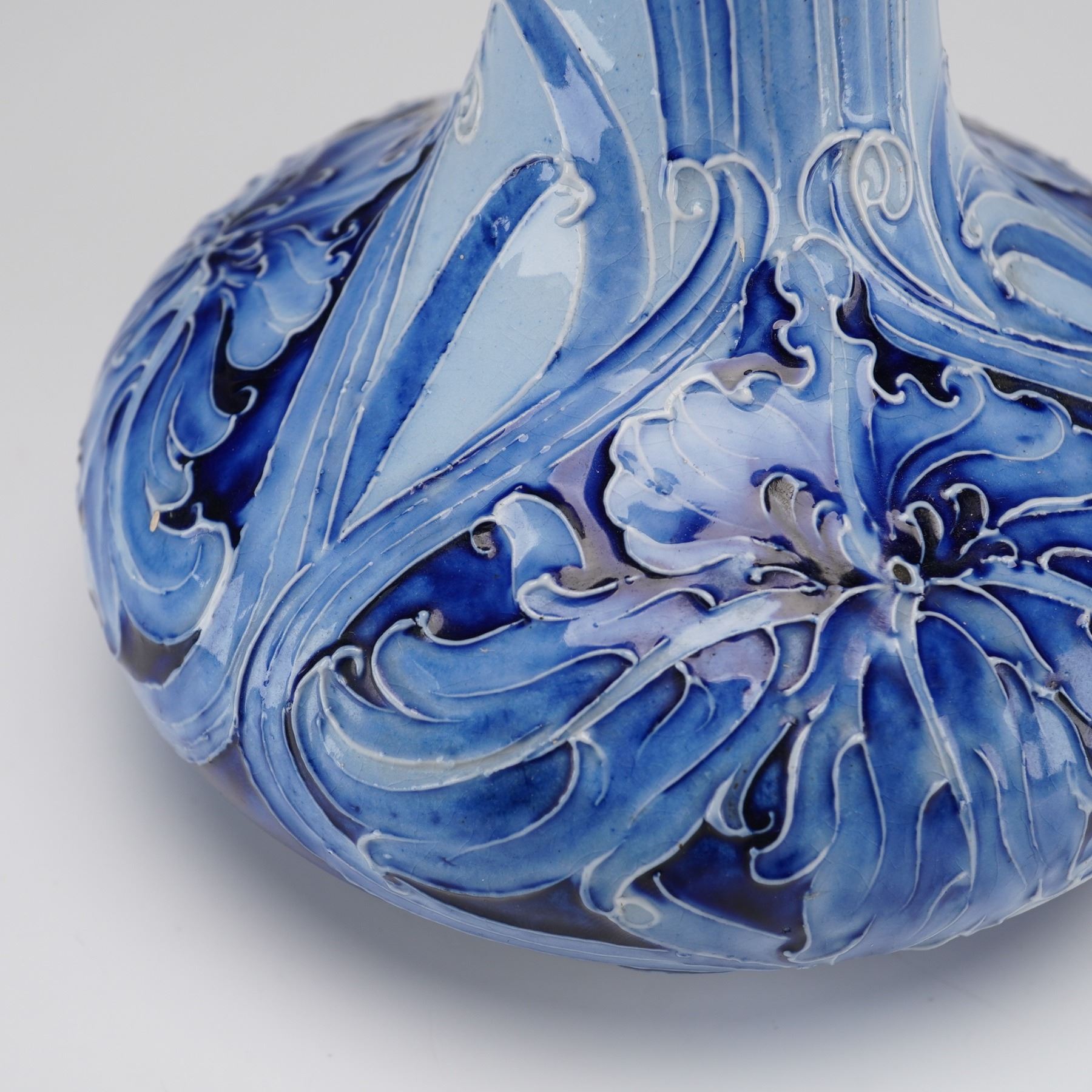 Pair of Macintyre Moorcroft Florian Cornflower Vases, c.1900. the shallow tall tapering stems with frilled borders tube lined and decorated with flowerheads and leafage in varying shades of blue. Printed brown mark No. M1057 with written signature in green.