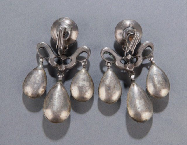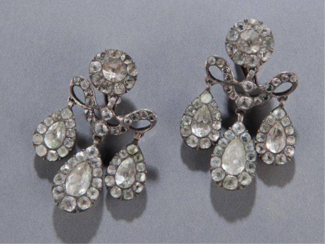 silver. girandole earrings. A pair of late 19th c. girondelle paste earrings. Set in silver. 1 1/4" x 1/4". Tw 0.61 t oz.