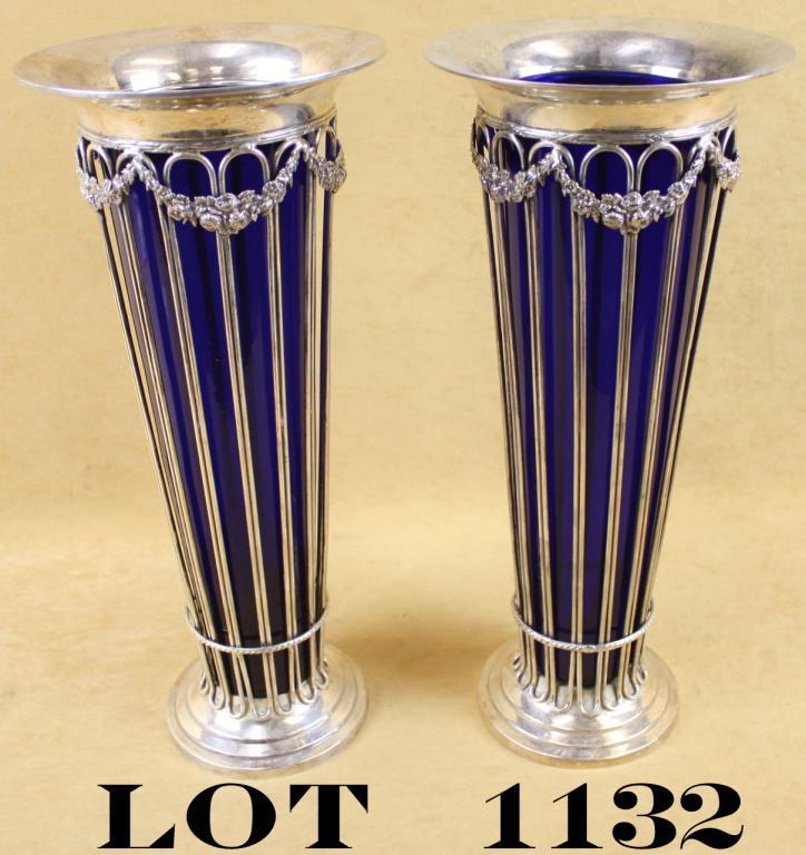 Pair of magnificent European silver vases w/ cobalt blue glass inserts measuring approx 16 1/4" in height and 850-900 fine silver, probably Scandinavian made 1920-40's by styling. This pair came from the northernMichigan estate of one of the car barons. Weighing approx (112 total ounces) refined to 100 oz pure at $22 silver. Approx $2200+ melt. Est. $1,500-$3,000+ With appraisal by G.I.A. graduate and master jeweler. Shows 5hallmark.