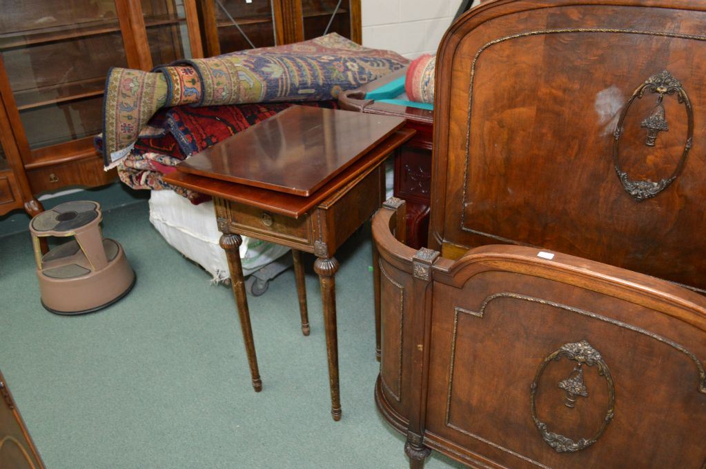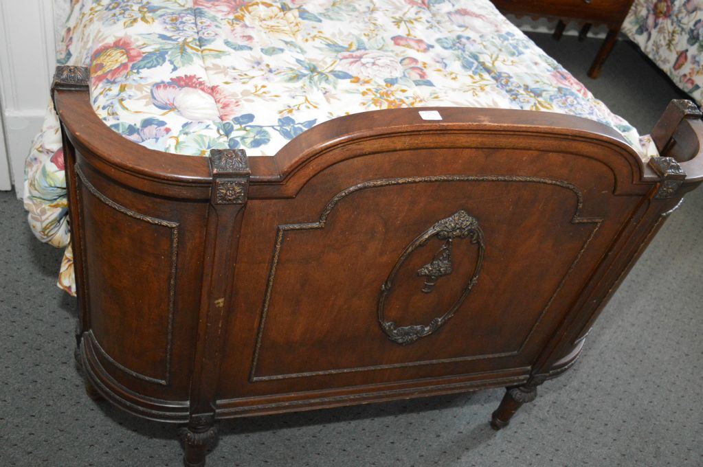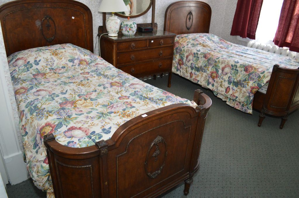 Pair of matching French twin beds with cast floral decoration and a matching bedside table