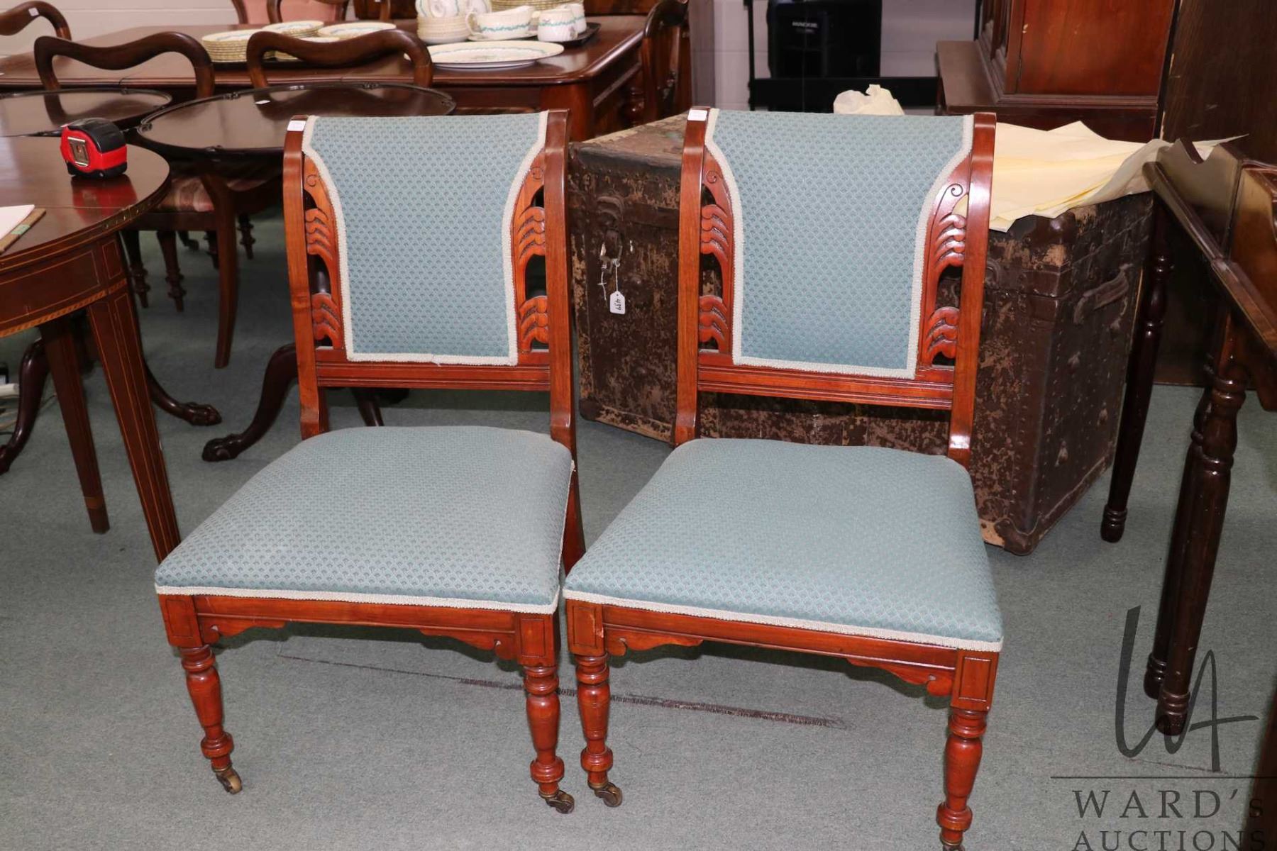 Pair of matching antique slipper chairs with turned supports, sitting on brass castors, each with blue brocade upholstery, 15" in height