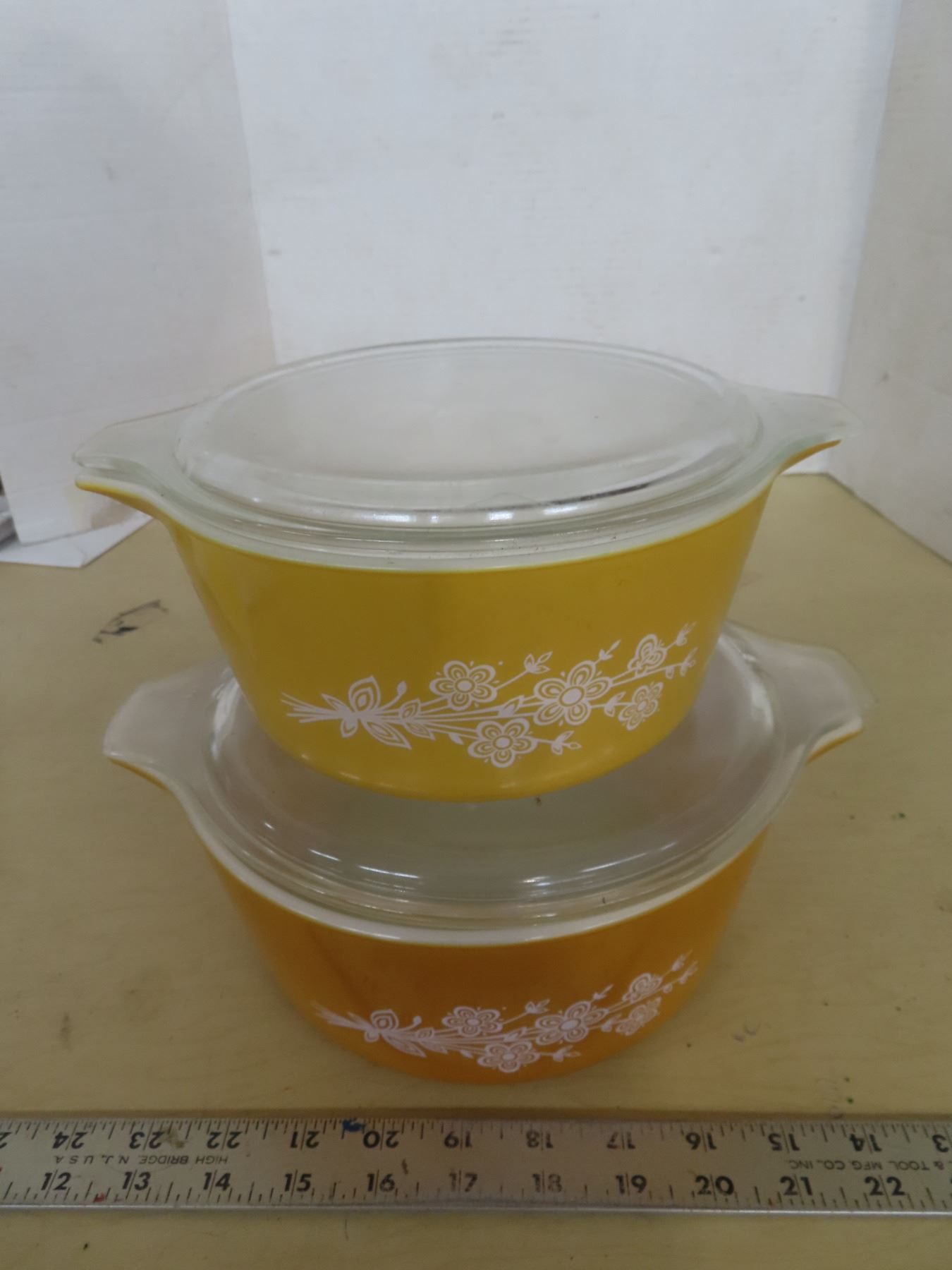 Pair of matching casserole dishes- gold daisy with lids- 1.5L and 2.5L