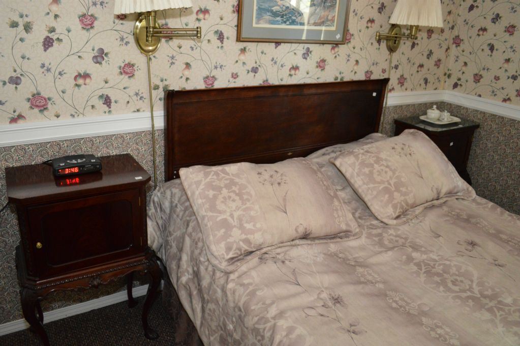 Pair of matching mahogany single drawer commode style night tables and a double size headboard with footboard and rails