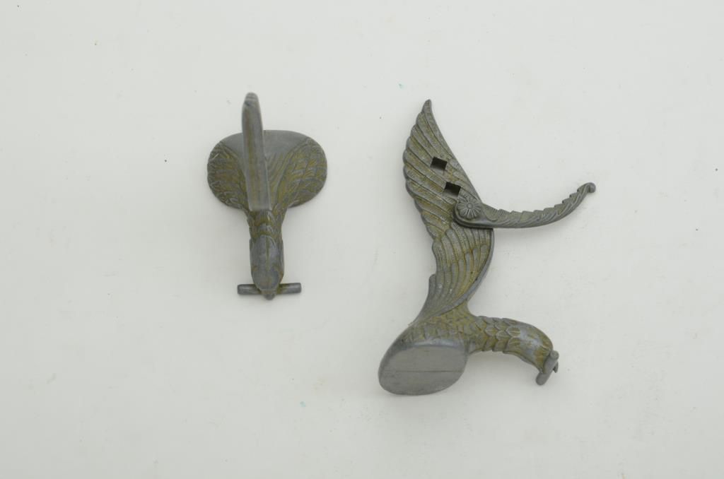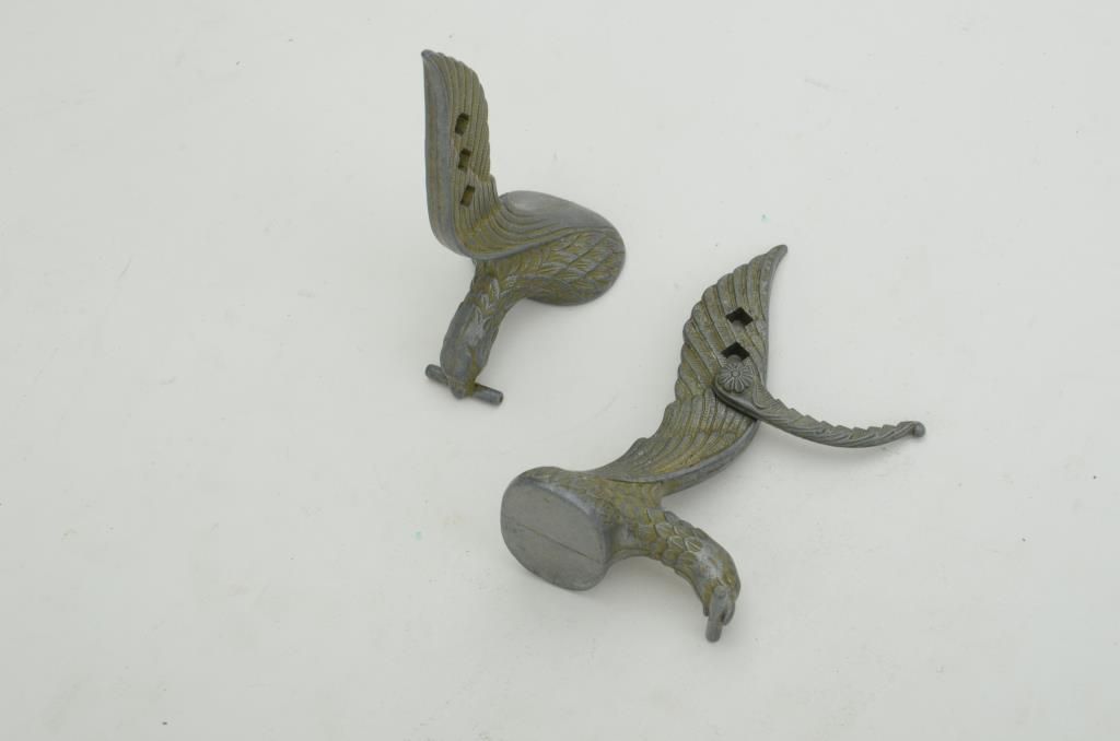 Pair of metal adjustable winged eagle display stands approx. 4” in height, showing some age; could be used to display a small revolver or collectible belt knife; in overall very good condition. Est.:$100-$200.