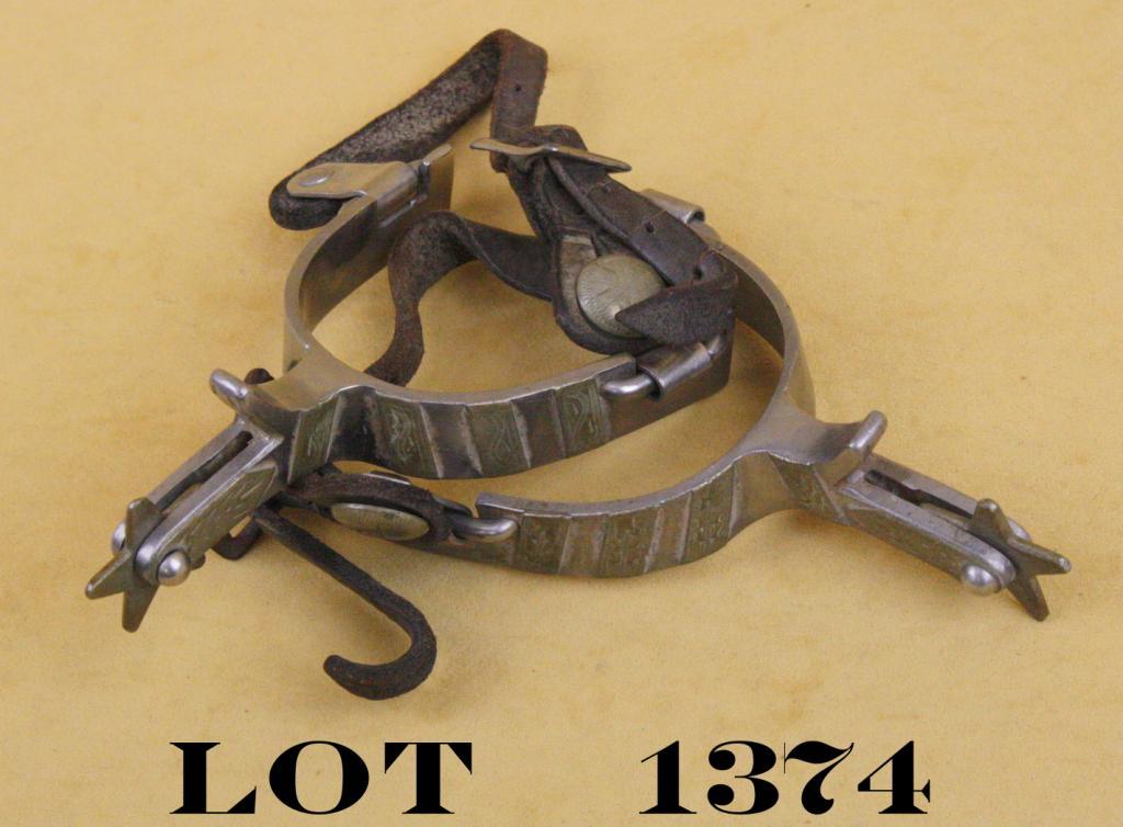 Pair of metal spurs with engraved silver panels on one side of each spur, only marking is an “ST” on one of the spurs; old leather straps with buckles. Est.: $50-$100.