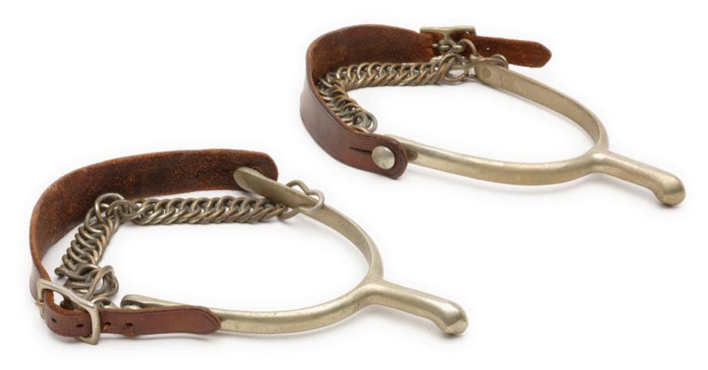 Pair of military spurs with heel chains and leather straps, each marked “US” & “A.B.”. Est.: $75-$100.