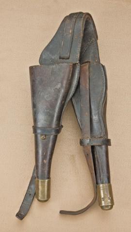 Pair of military style saddle holsters, missing covers, brass tips, type associated with Walker Colt pistols. The rears are stamped in leather “DB”. The holsters are in good condition with some cracking, crazing, small losses. Good patina on the brass caps. Caps measure 2-1/2” from end to end. Leather shows some cracking and losses. One holster is showing stitching unraveling at the rear. After 40 years of buying and selling Walkers I have not found a conclusive description of Walker saddle holsters, but these appear correct and are of the right age, period, and fit Walkers well. Est: $750 - $1,500