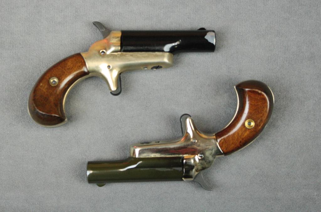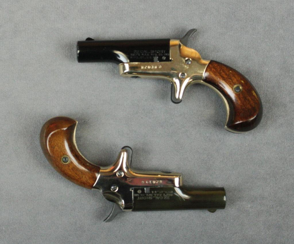 Pair of modern Colt single shot derringers in  factory wood display case, .22 short cal.,  2-1/2” barrels, nickel finish to frames,  smooth wood grips, #s82039D and 82038D. Both  guns are in overall fine condition with82038D showing some flaking at the muzzle of  the barrel; case is overall very good with a  couple of mars from storage.  Est.:   $200-$400.
