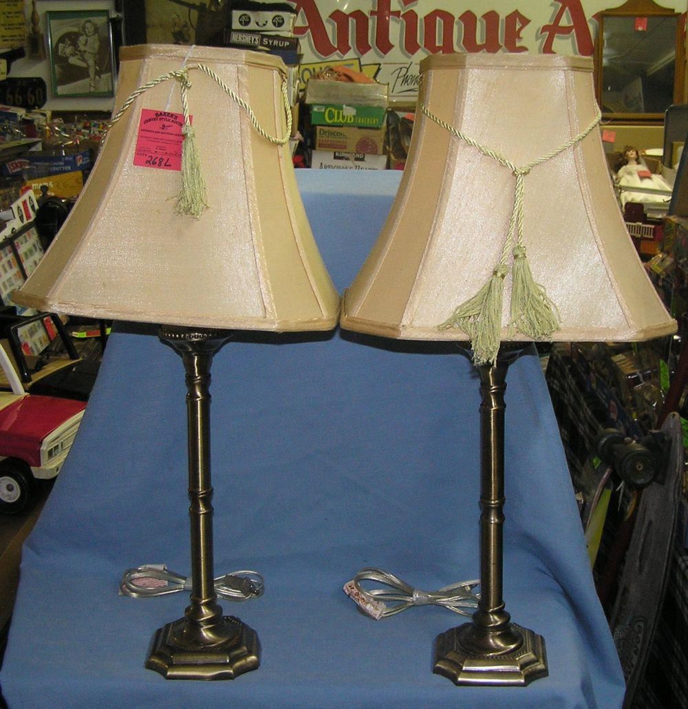Pair of modern brass table lamps with silk shades est. value $65.00-$75.00