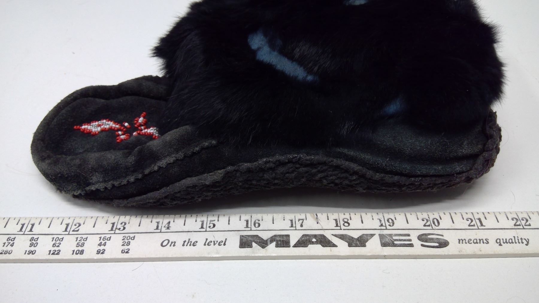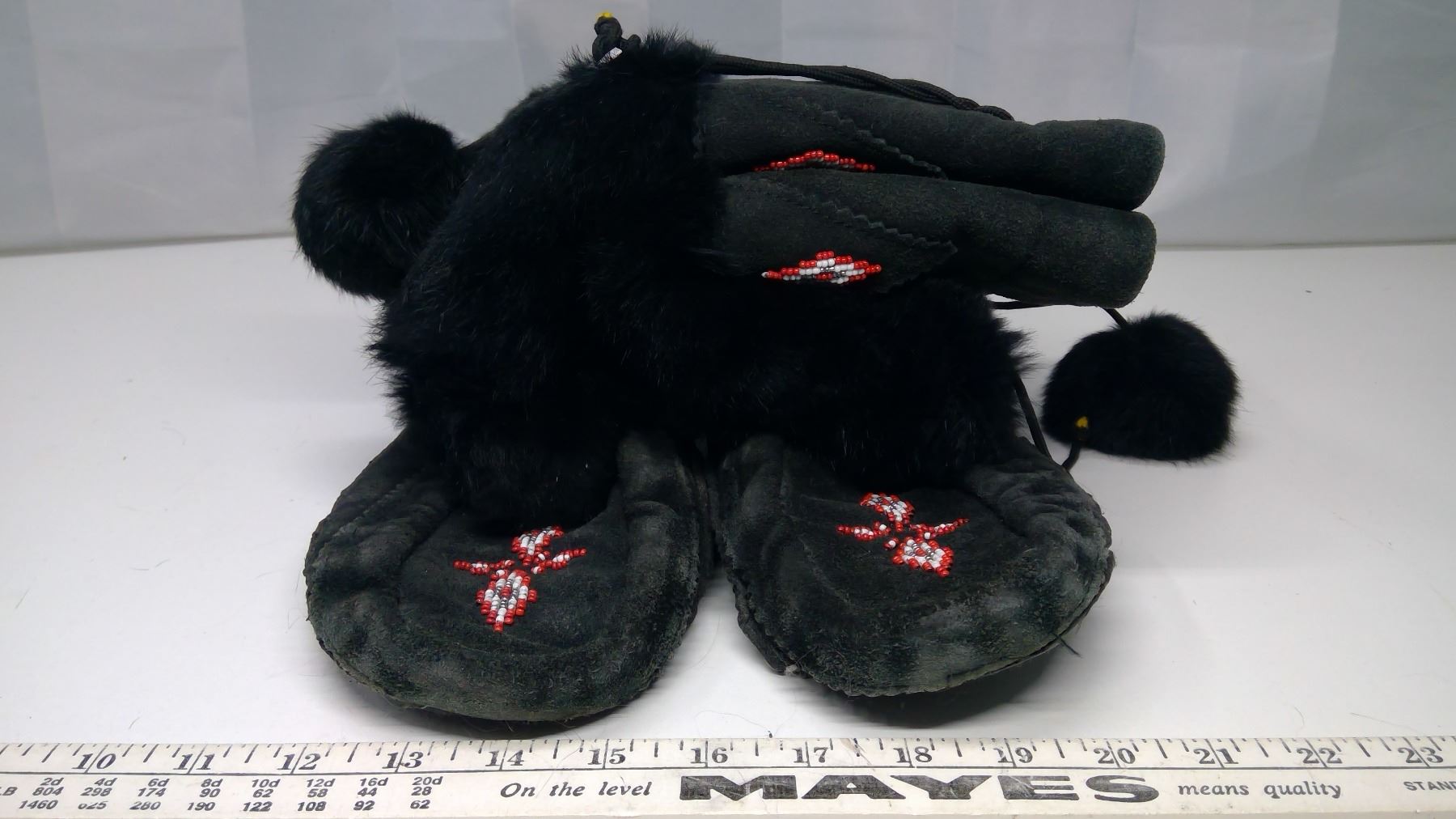 Pair of mukluks, rubber soles, some wear, missing one pompom