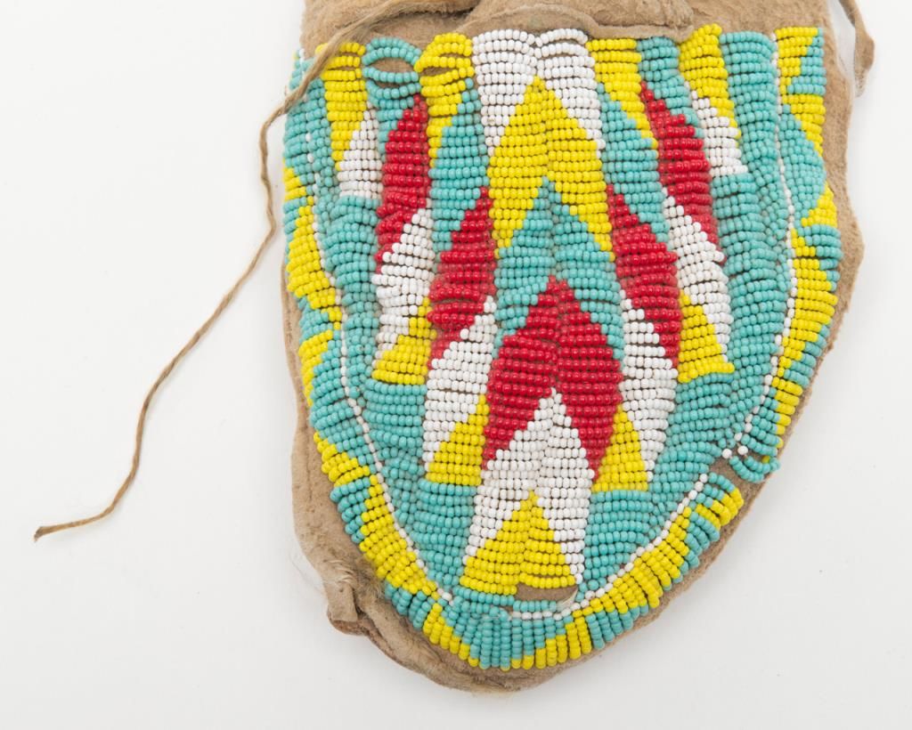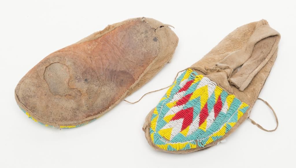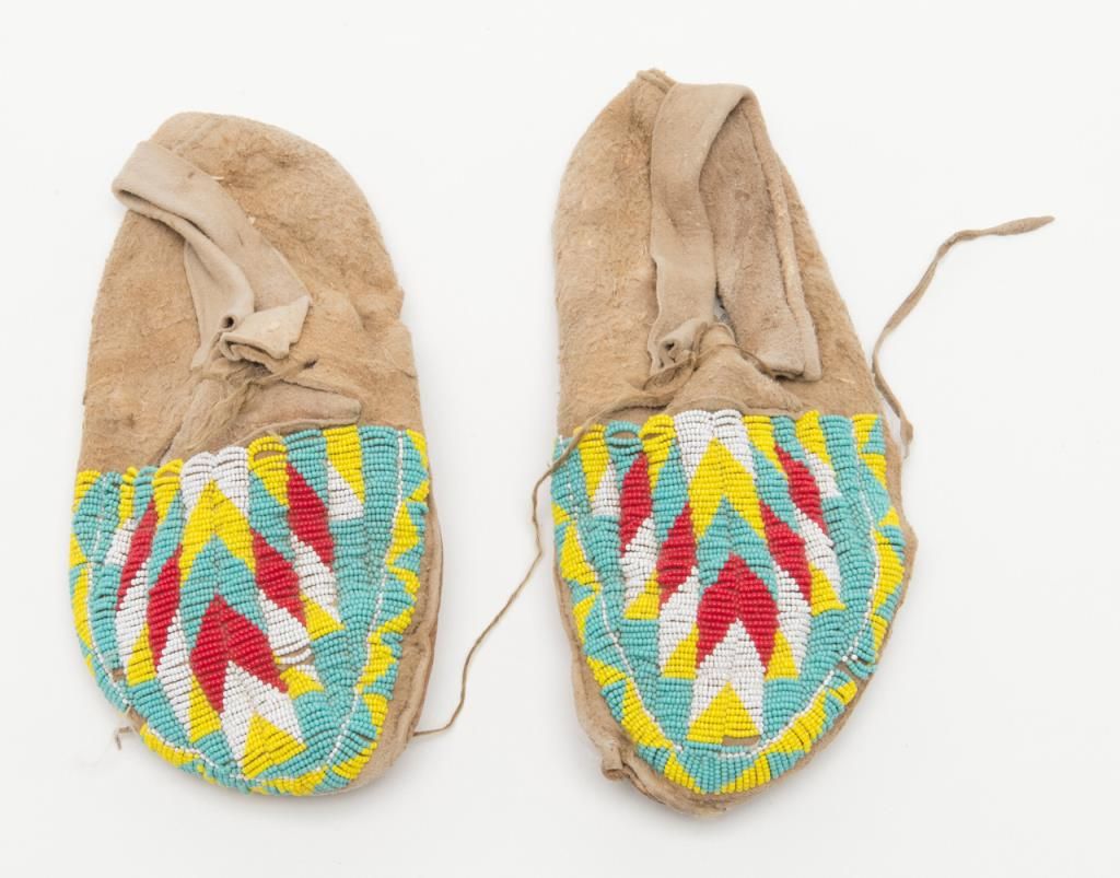 Pair of multicolor beaded moccasins men's size, pre-war time period from Wind River Wyoming collection. Tribe not identified, in good condition. Est.: $250-$500.